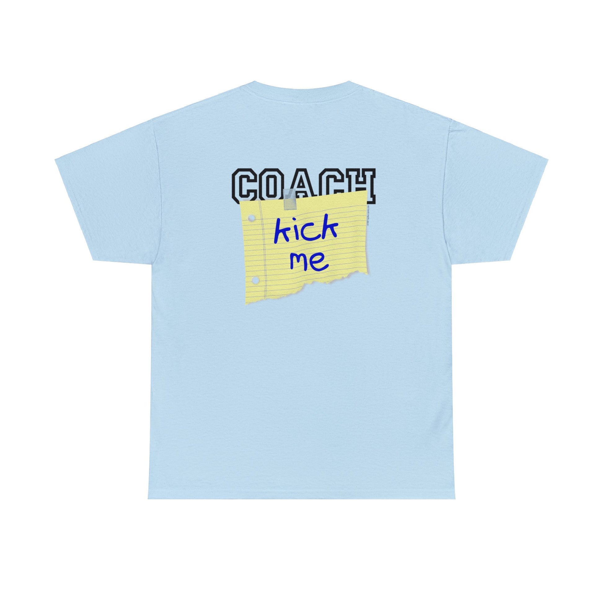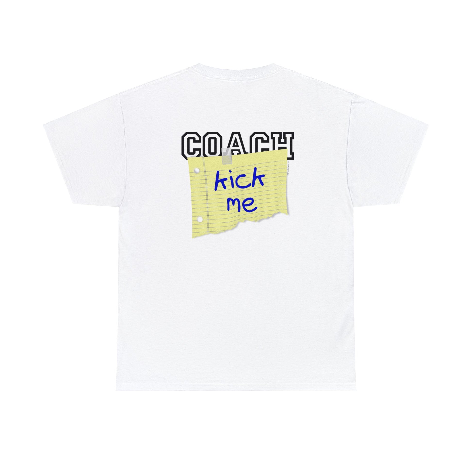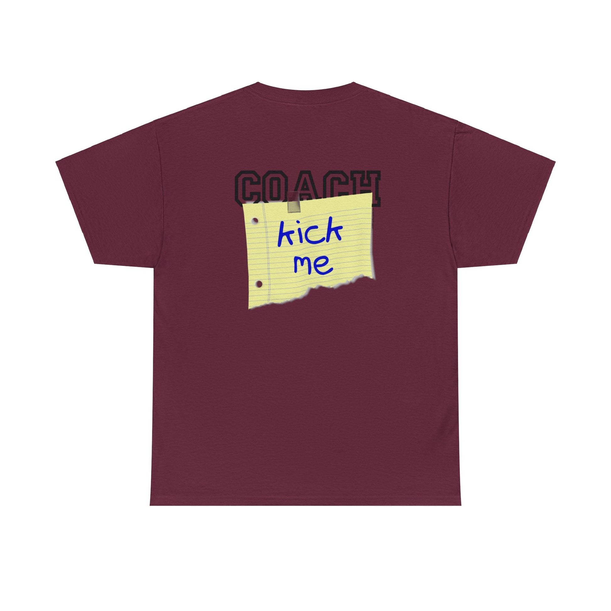 Coach Kick Me Fun Parody Coaches T-Shirt, Coach Shirt with Kick Me sign Taped to the back, Self Deprecating Sports Humor Tee