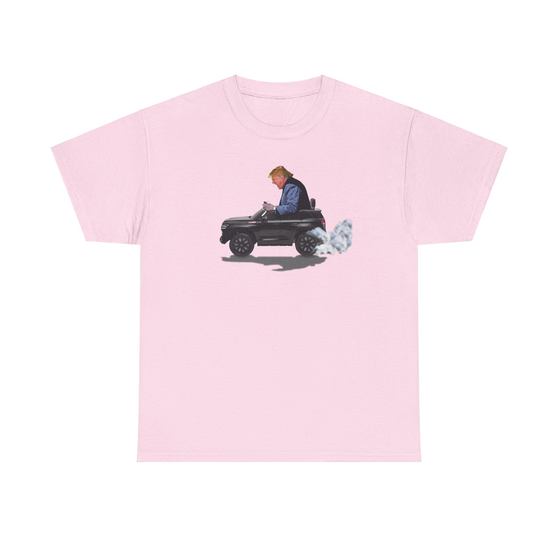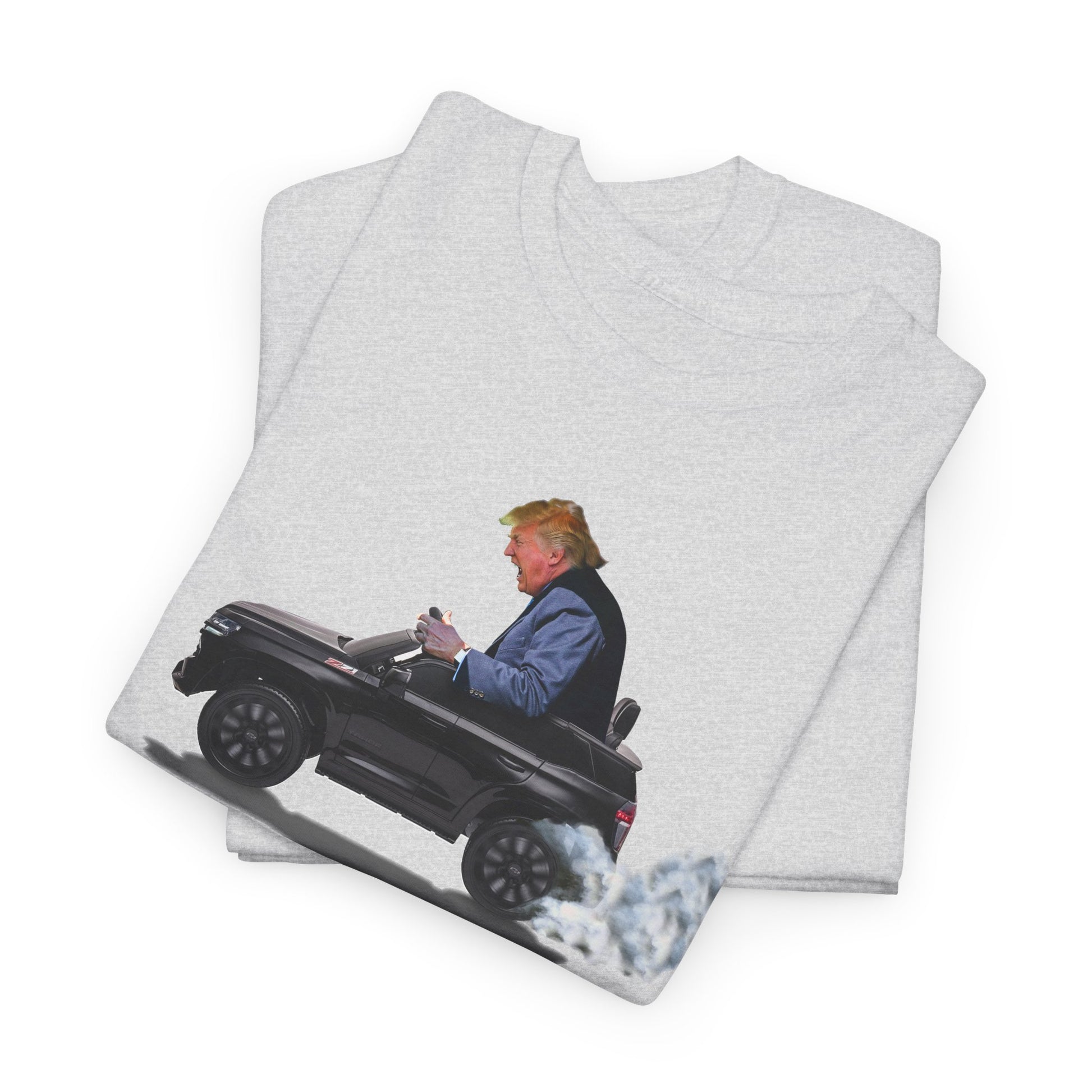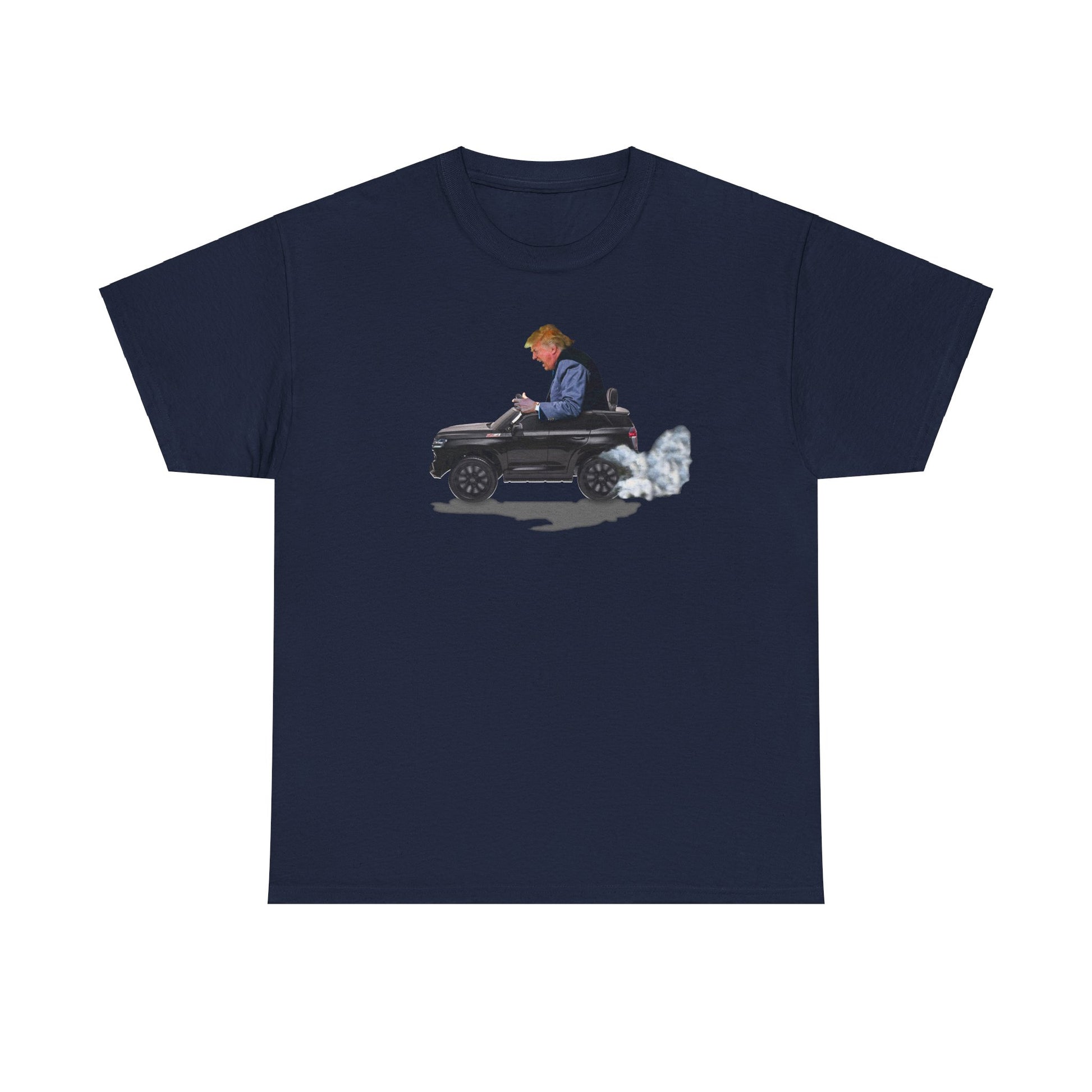 Funny Trump T-Shirt showing Donald Driving a Tiny battery powered toy car, Burning off Tires, Digital Photo Rendering