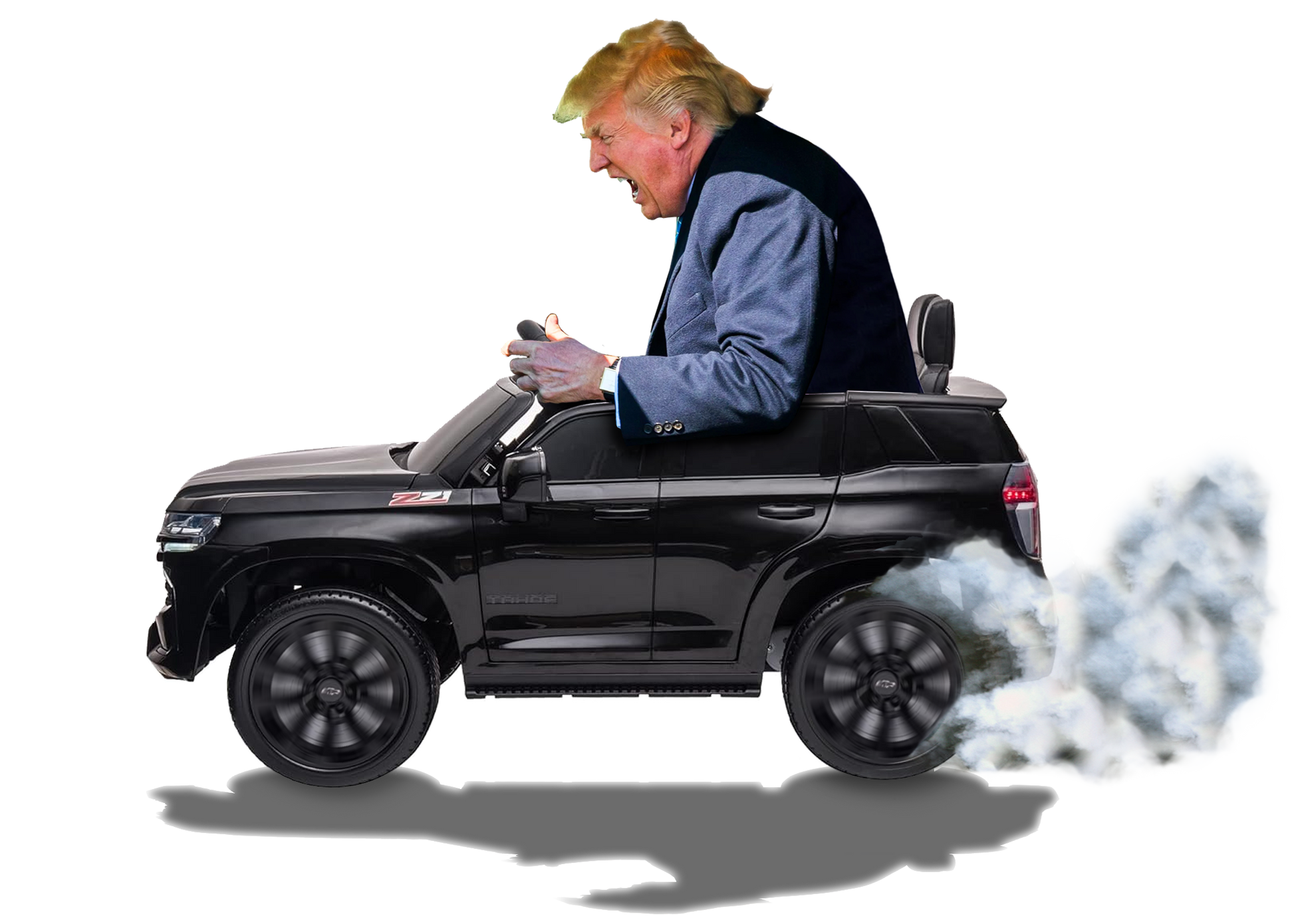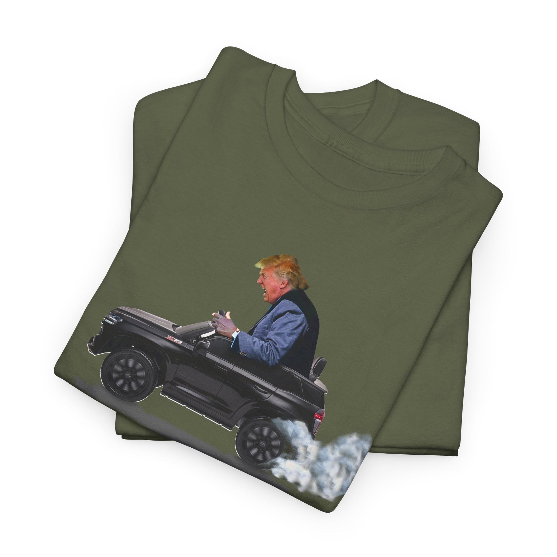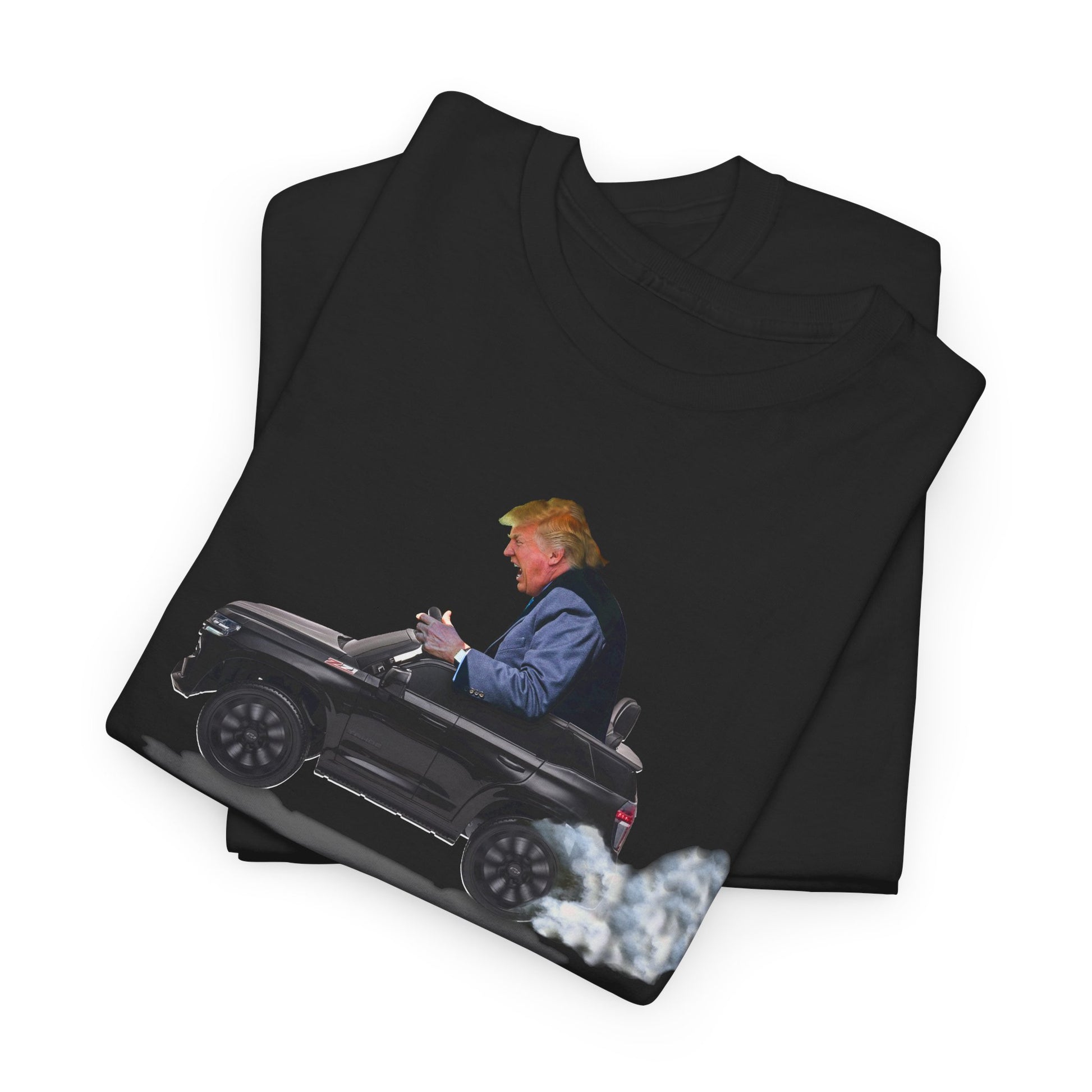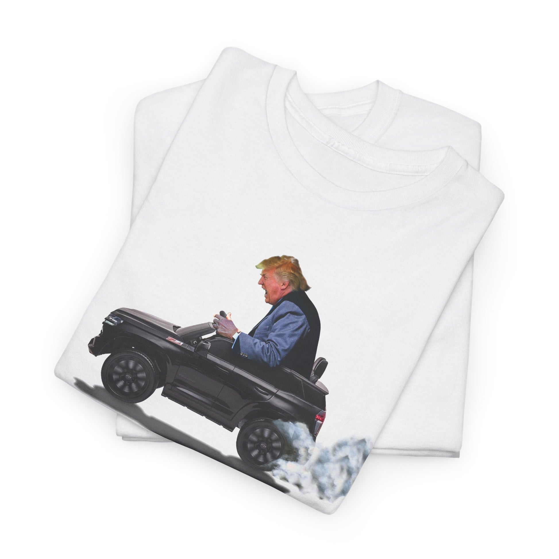 Funny Trump T-Shirt showing Donald Driving a Tiny battery powered toy car, Burning off Tires, Digital Photo Rendering