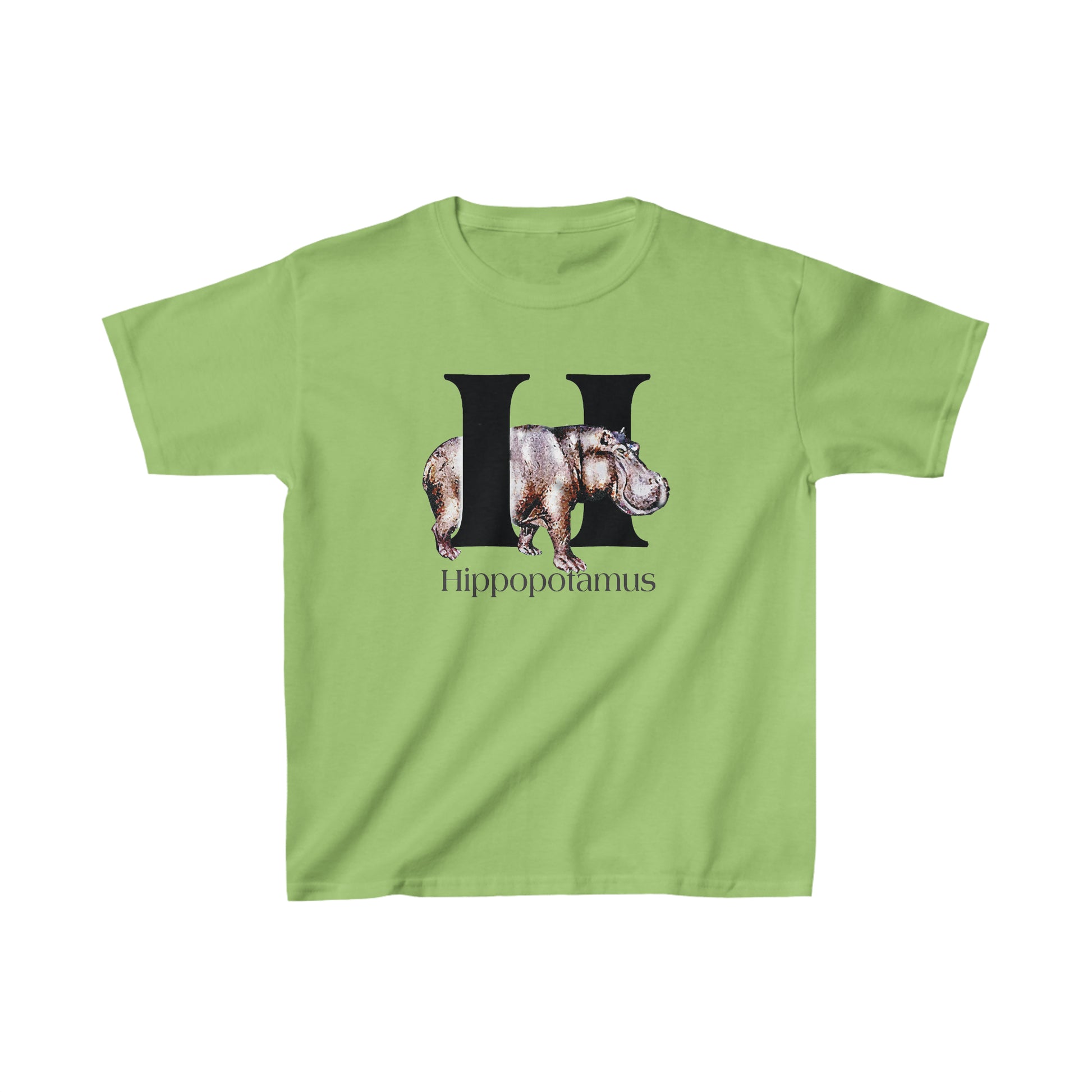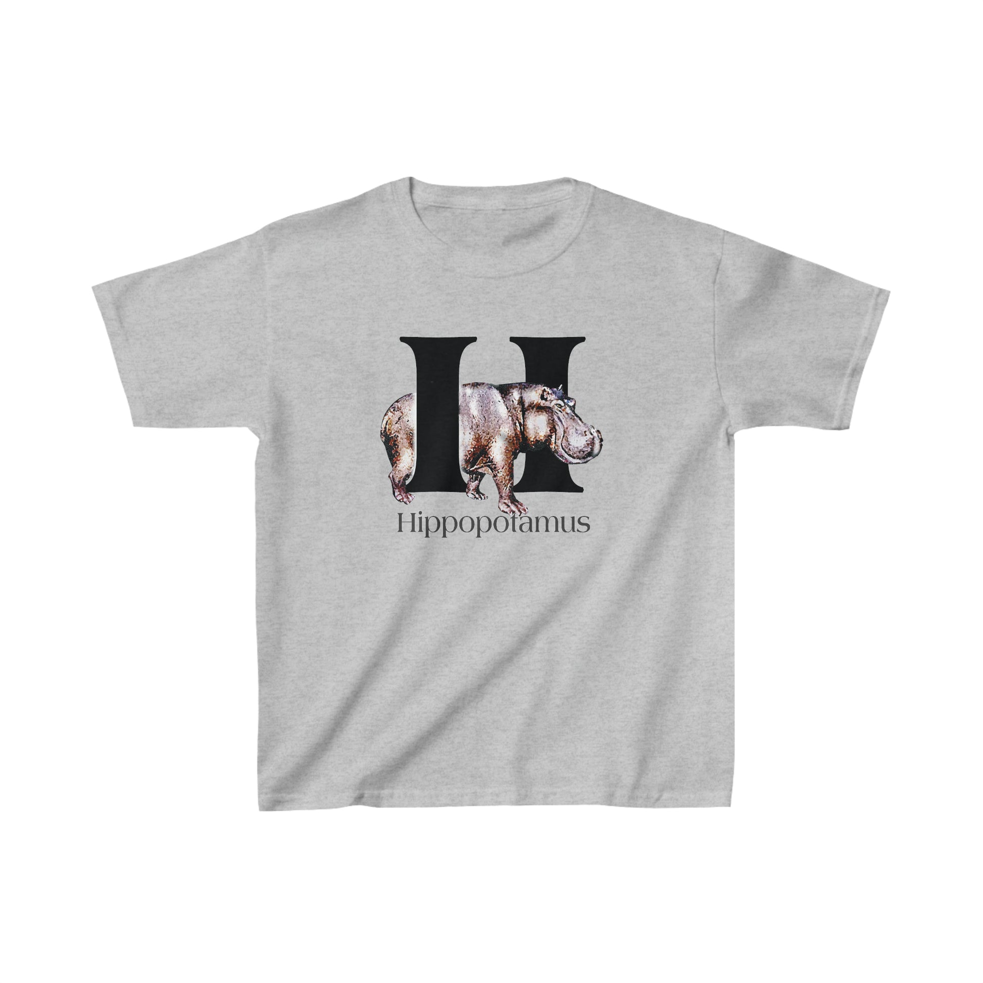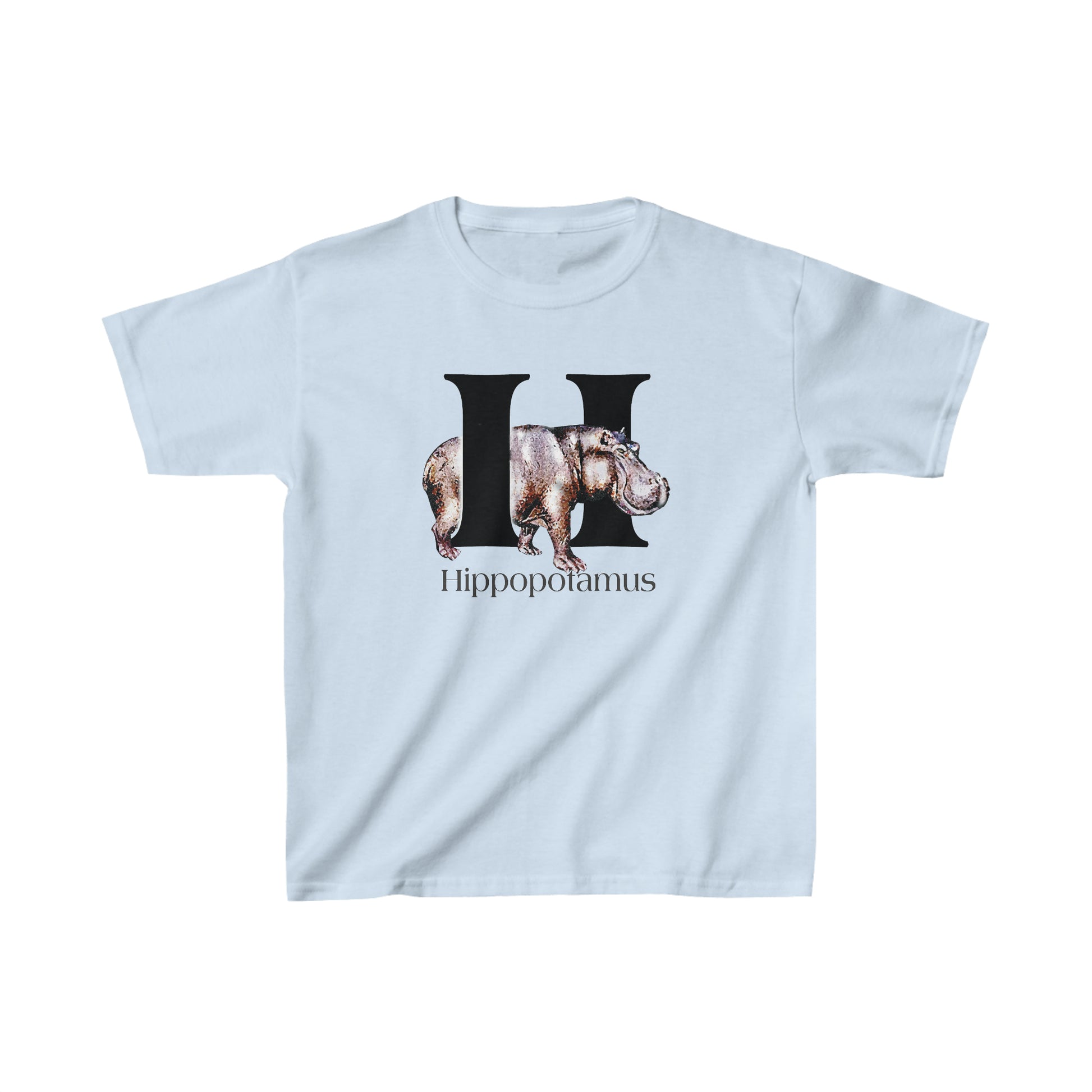 This bold Hippo poses with the capital letter H. This Hippopotamus t-shirt is designed with a classic illustrated look with bold letter H. This series of adorable animals are depicted as characters of the Alphabet. A for Alligator, to Z for Zebra.