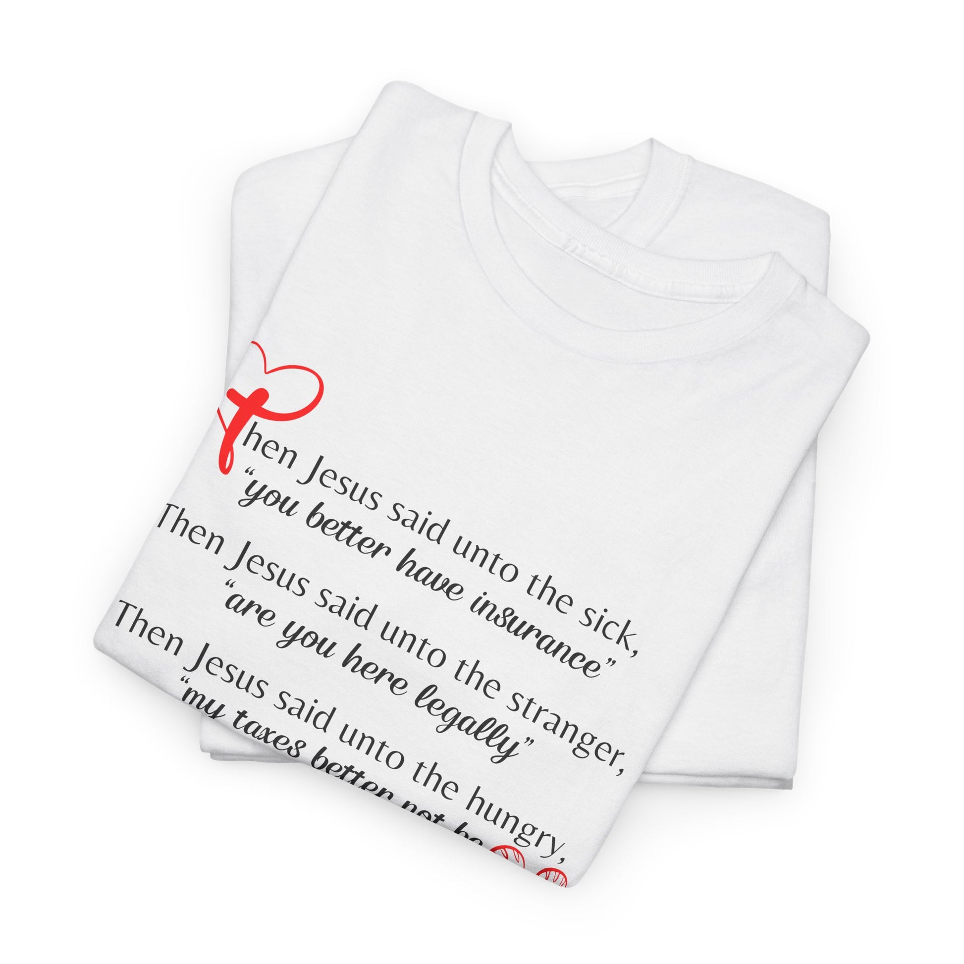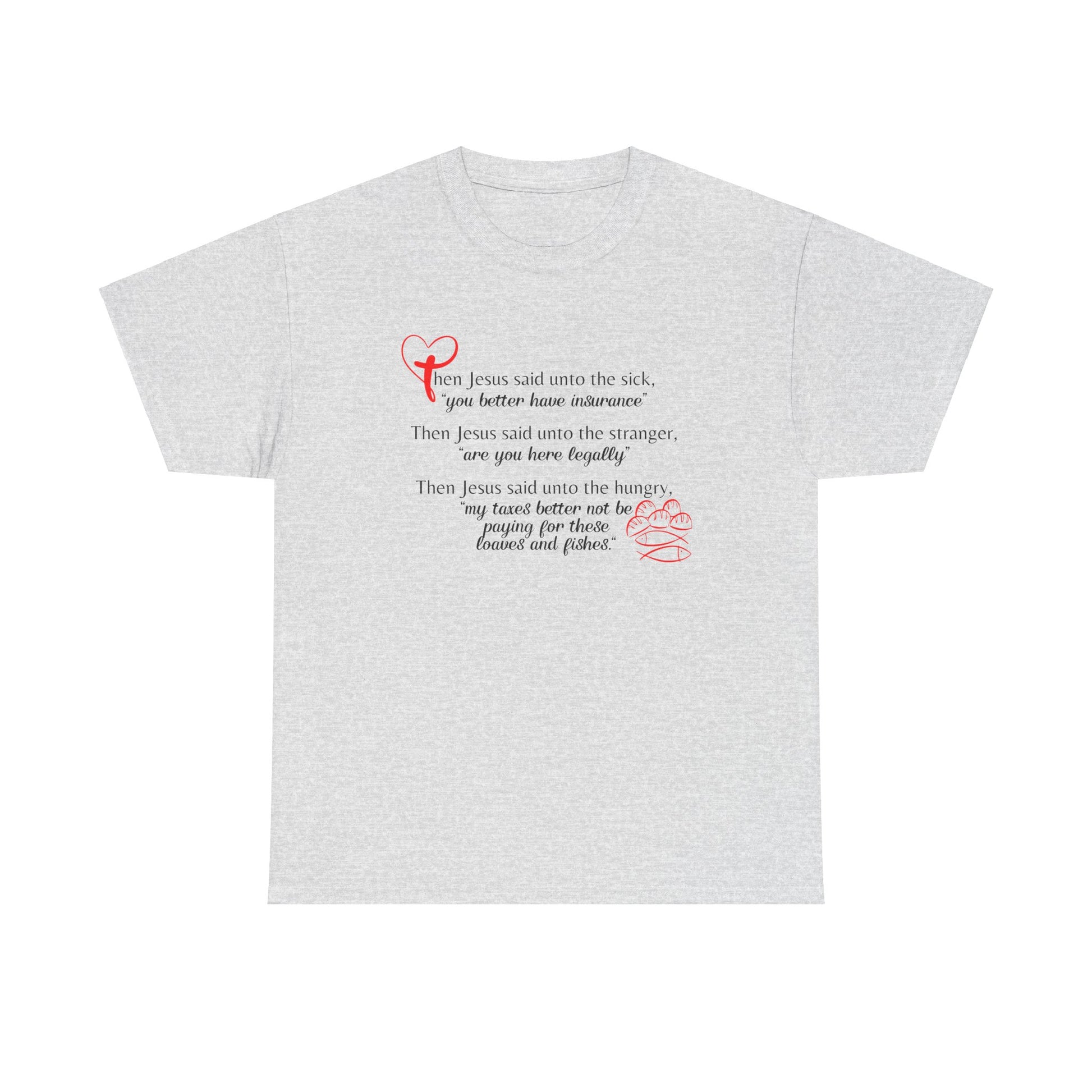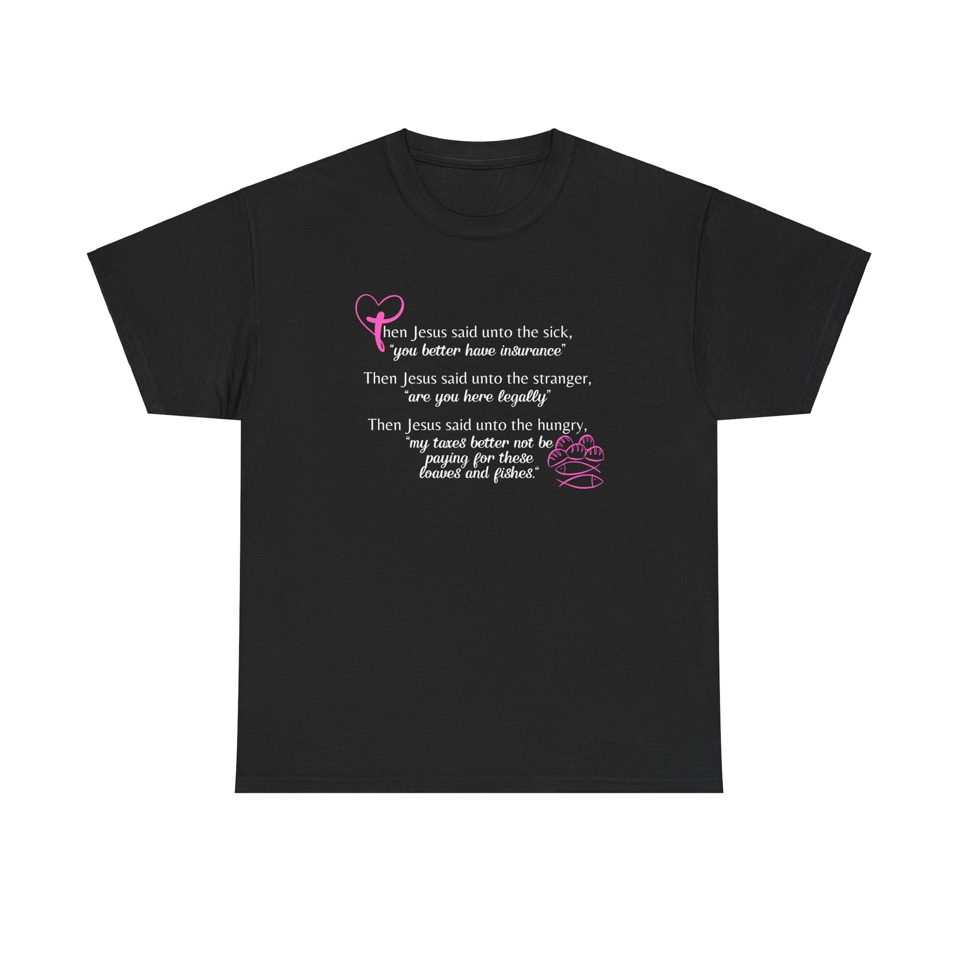 A humorous religious and political T-Shirt featuring Jesus Parables for the Sick, Strangers, and Hungry Disciples. This T-Shirt is perfect for those with a sense of humor and a love for religious satire. Ideal for wearing during religious gatherings, political events, or casual outings.