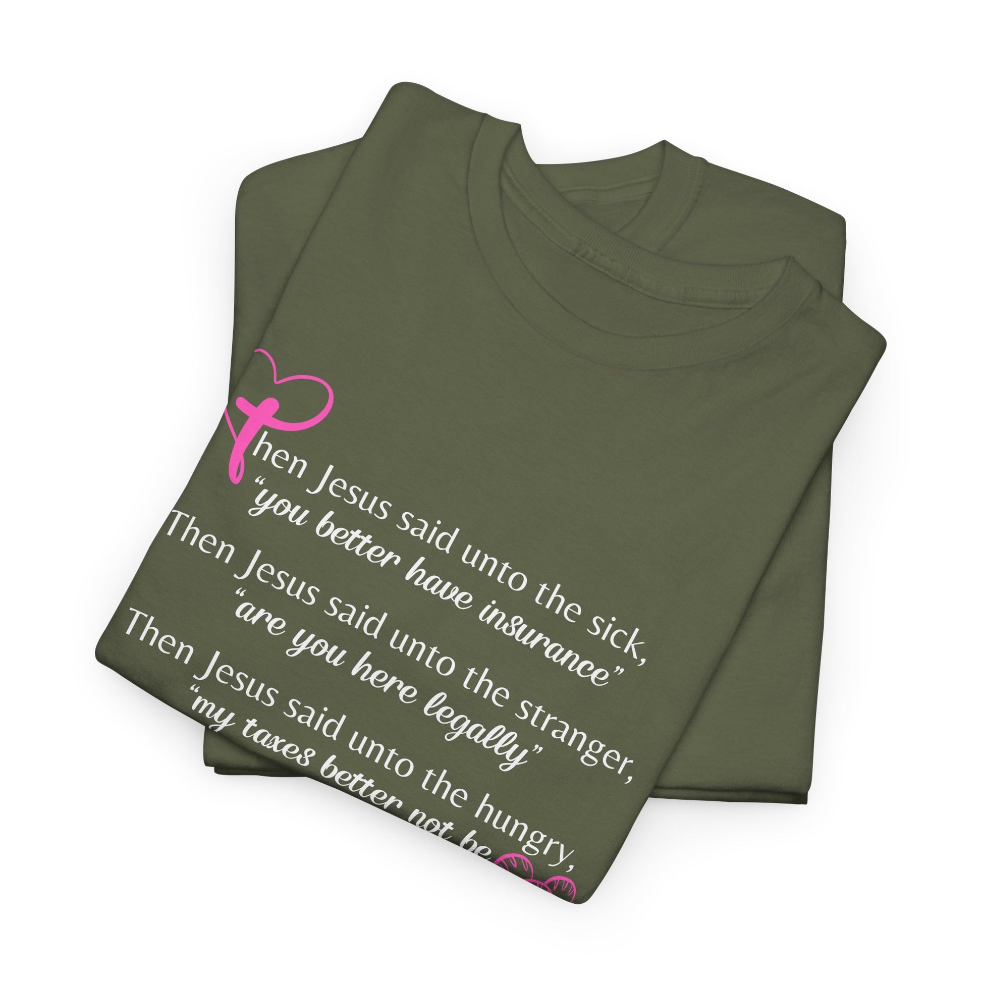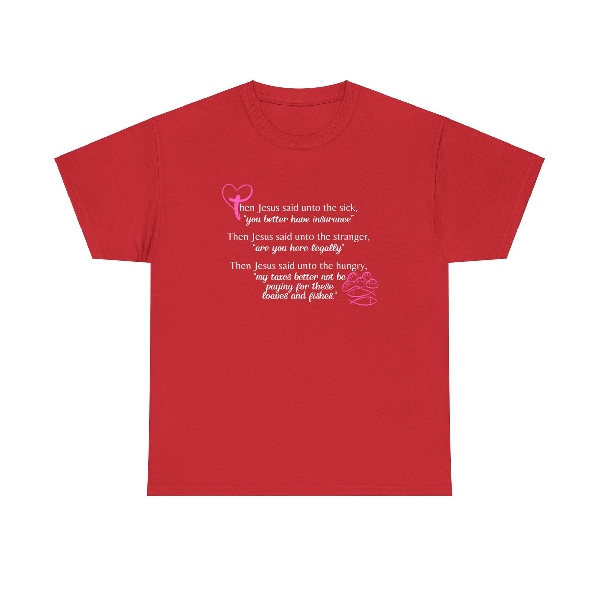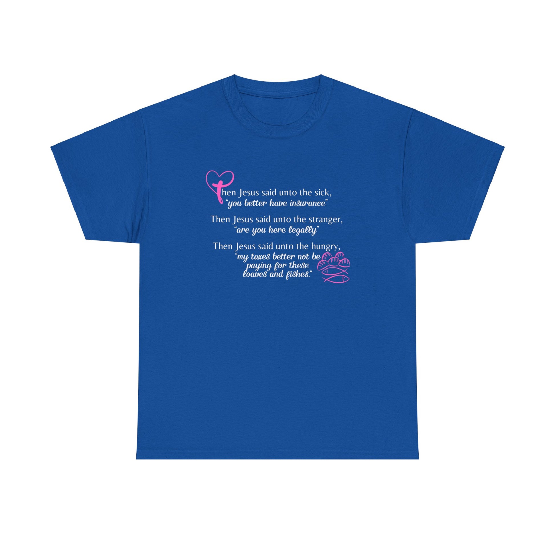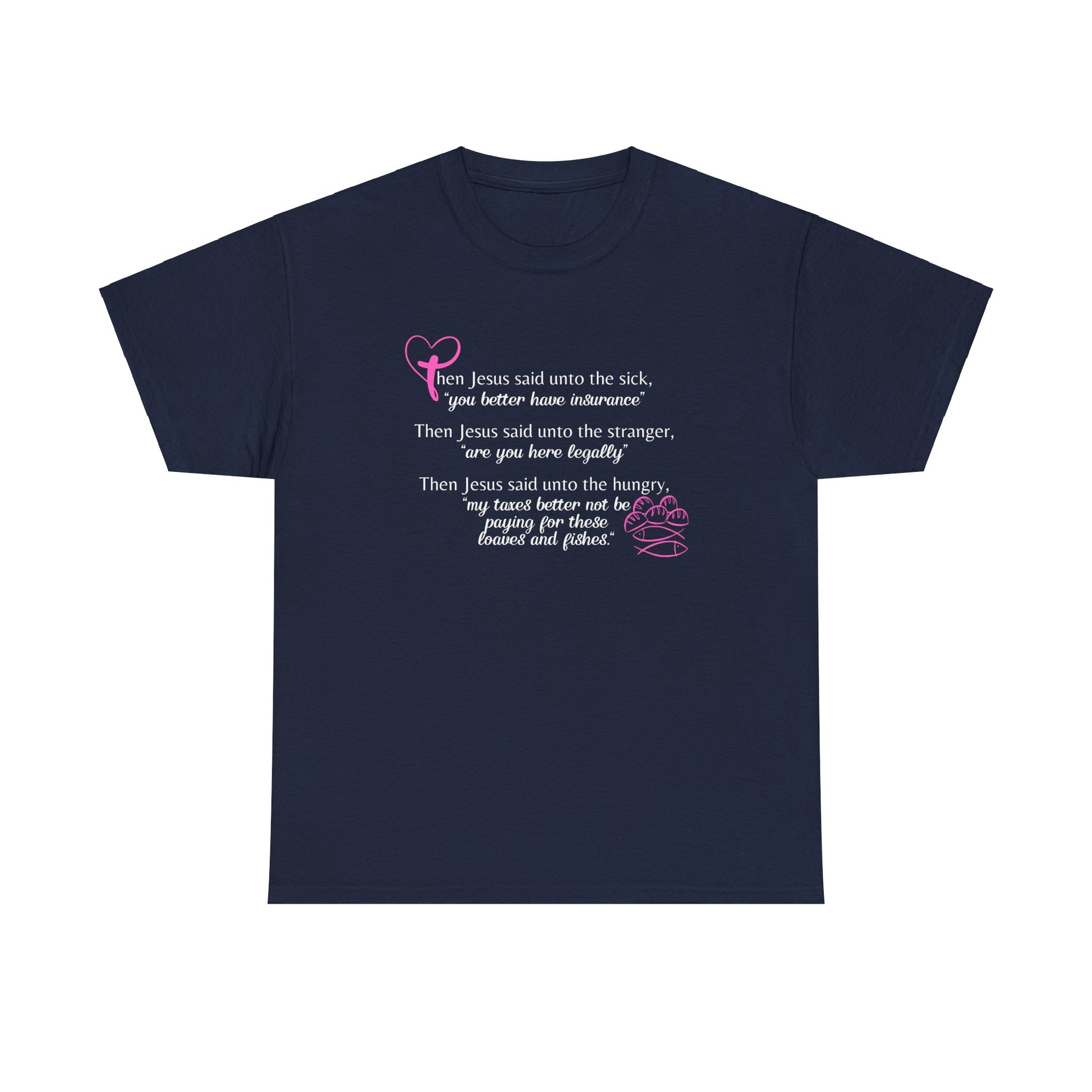 A humorous religious and political T-Shirt featuring Jesus Parables for the Sick, Strangers, and Hungry Disciples. This T-Shirt is perfect for those with a sense of humor and a love for religious satire. Ideal for wearing during religious gatherings, political events, or casual outings.