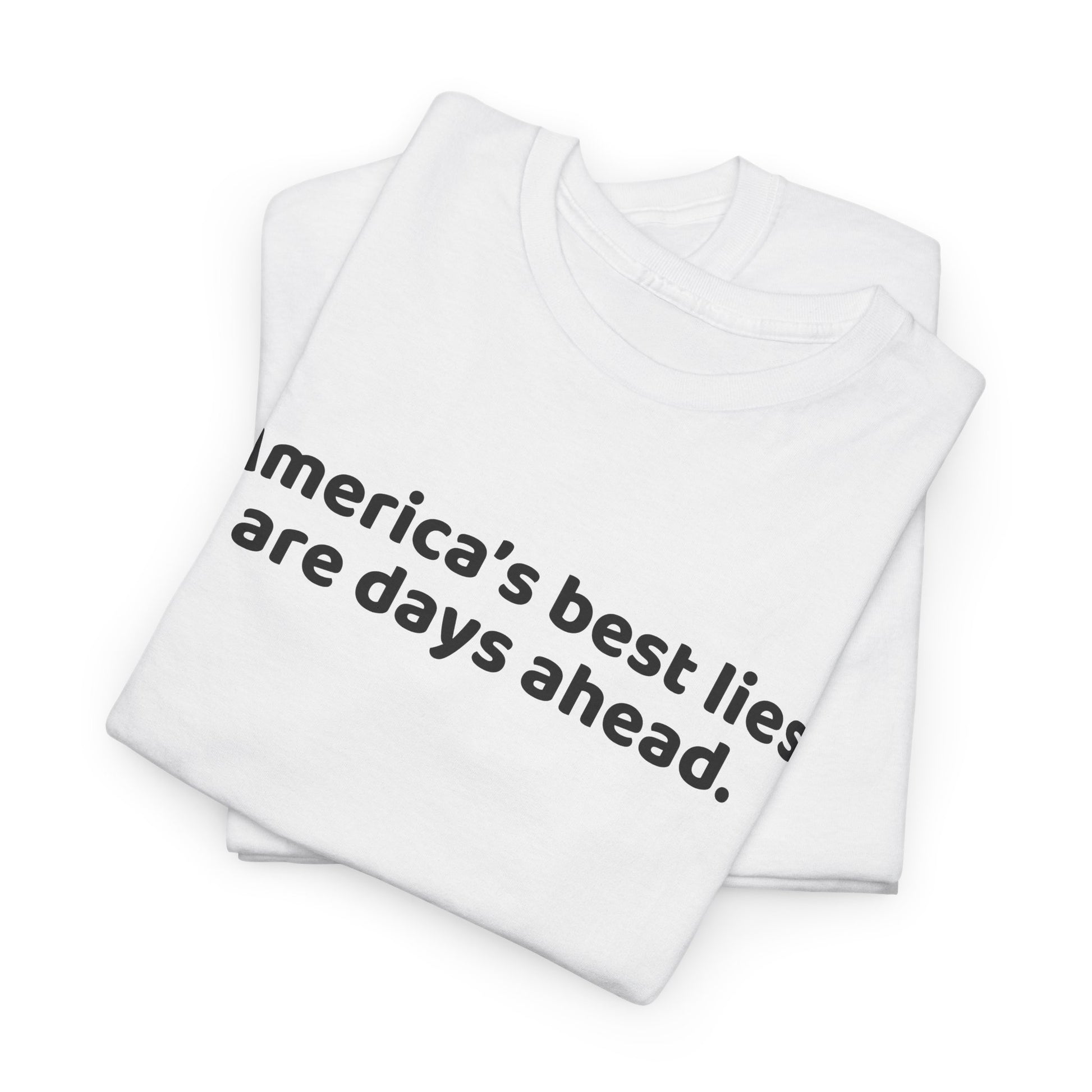 This play on those words Political humor T-Shirt featuring America's Best Lies are Days Ahead design. Perfect for those who enjoy political satire and want to make a statement. Ideal for wearing on Independence Day, election season, protests, and political rallies.