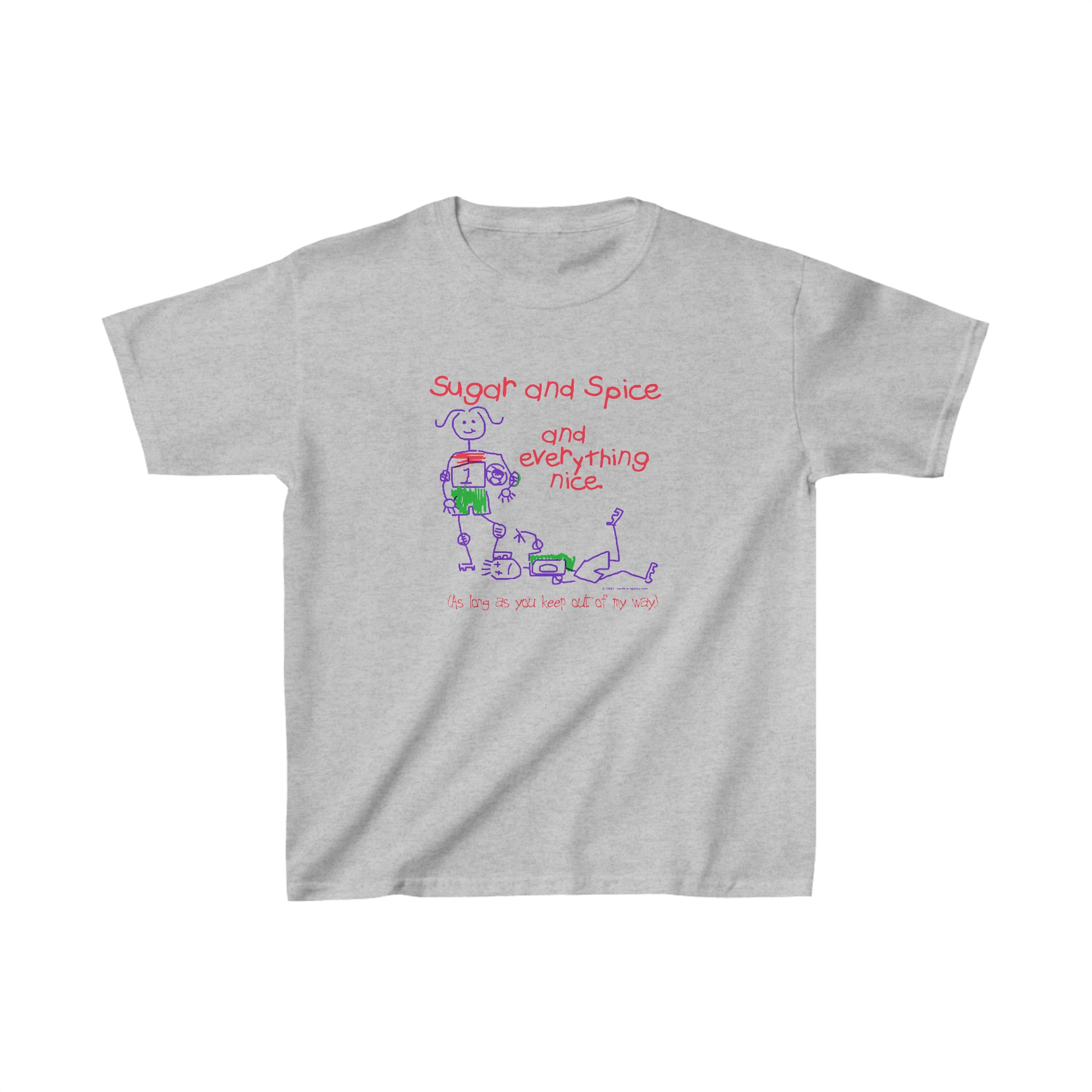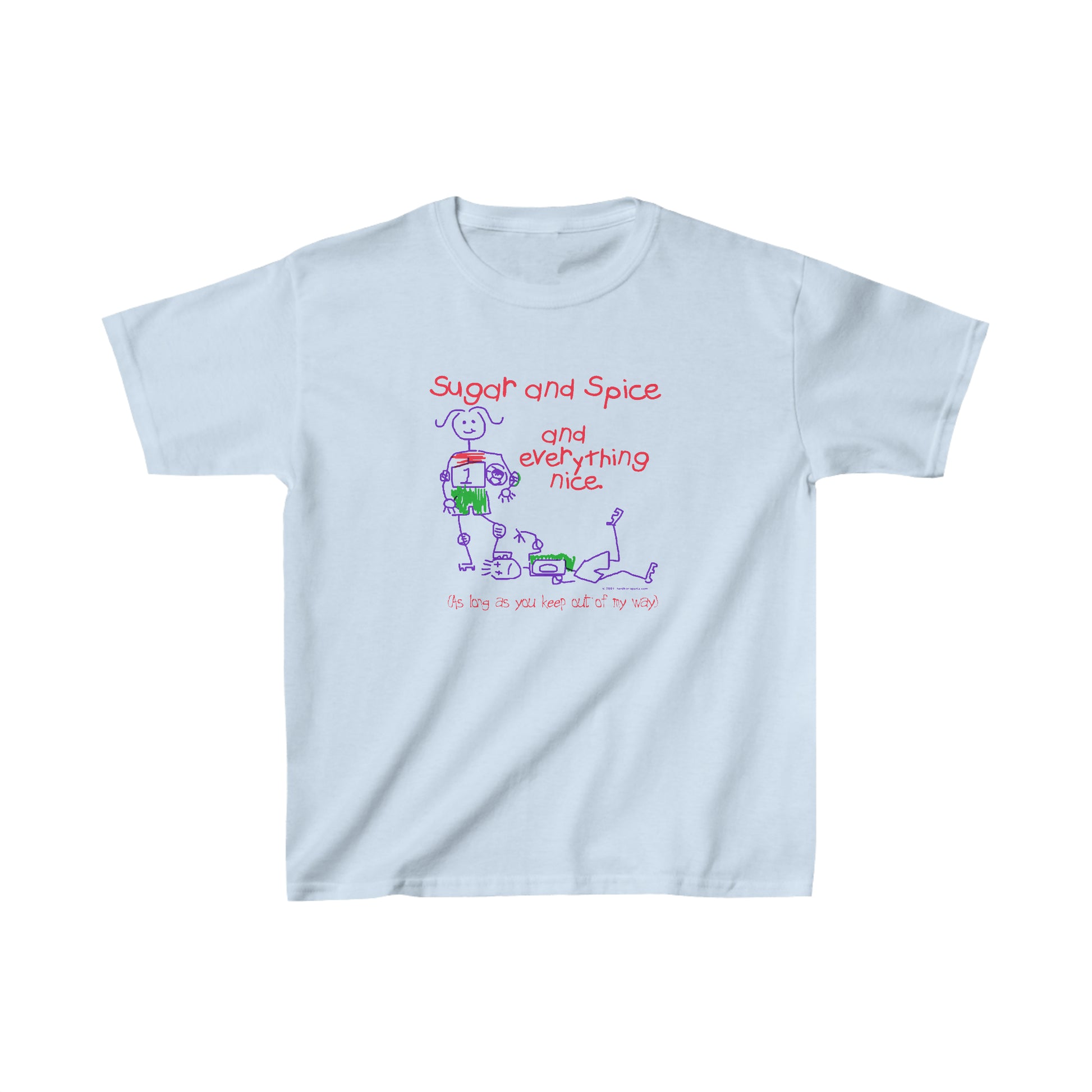 Girls attitude Soccer t-shirt reads: Sugar and Spice and Everything Nice As Long as You Stay Out of My Way. This shows the Girl Power of Soccer with a kid like drawing of a girl dominating her male opponent. Cute as a button Girl's Soccer T-Shirt.