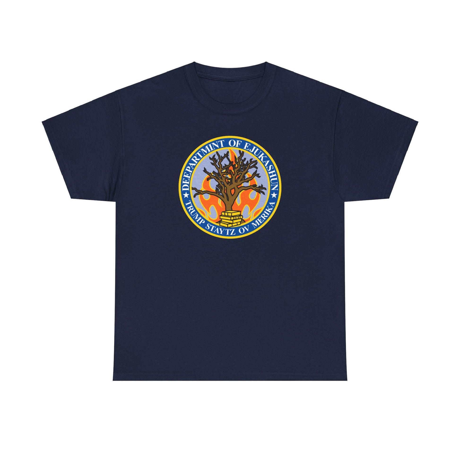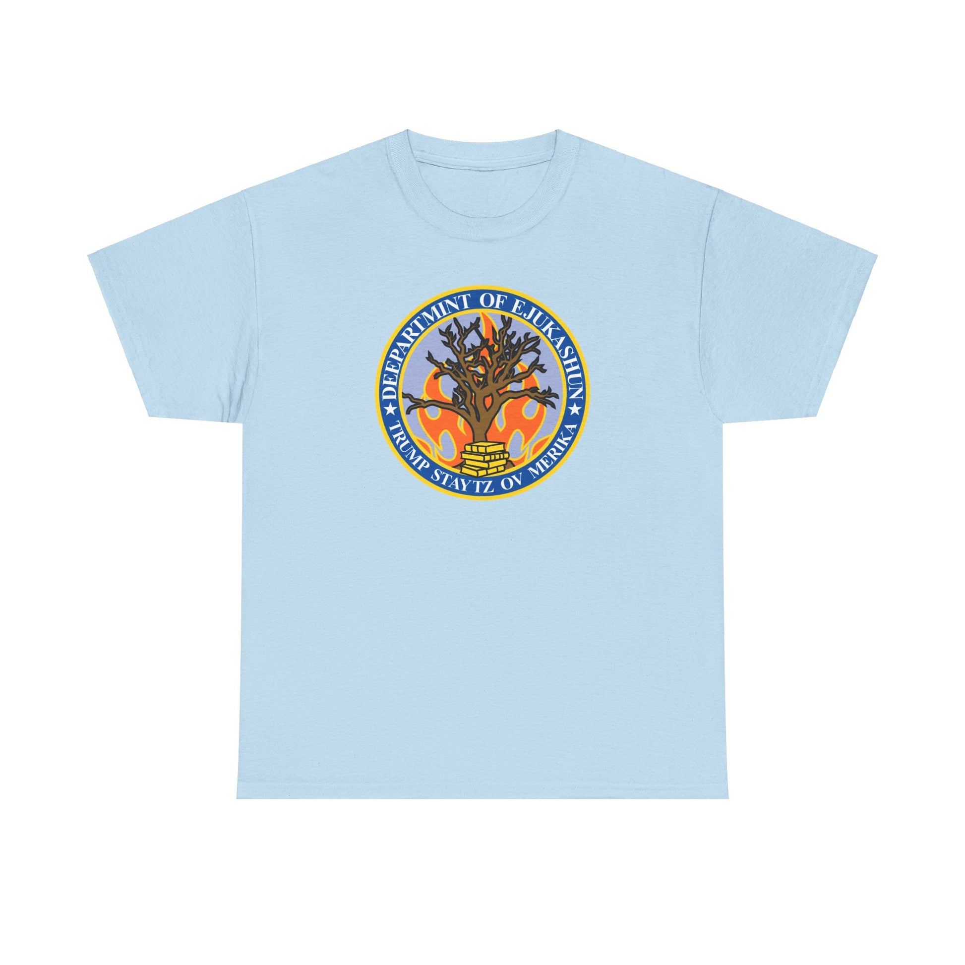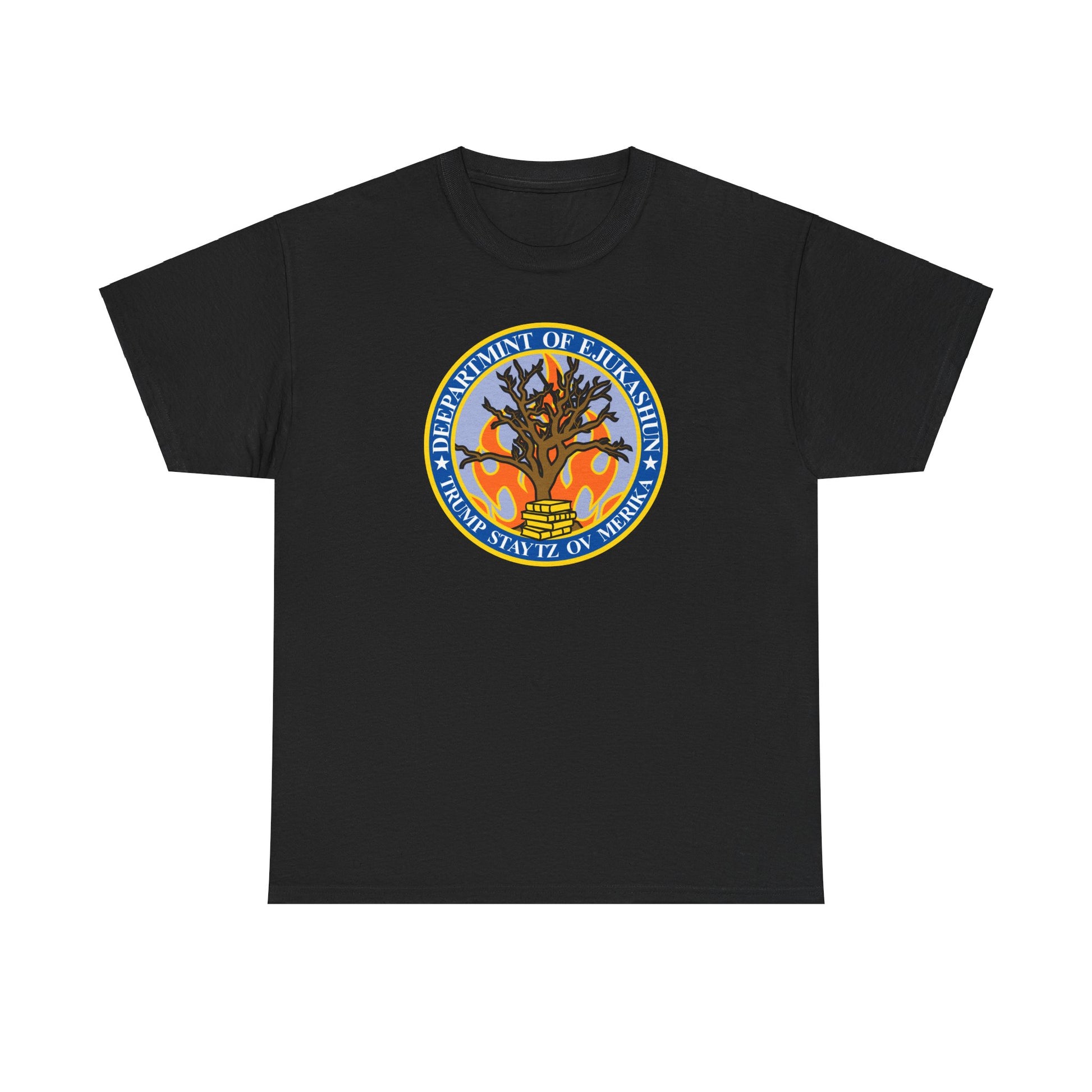 Trump Parody T-Shirt Department of Education, Misspelled as Deepartmint of Edukashun, Burning Tree, Banned Books, Dystopian, Sad Political Dark Humor