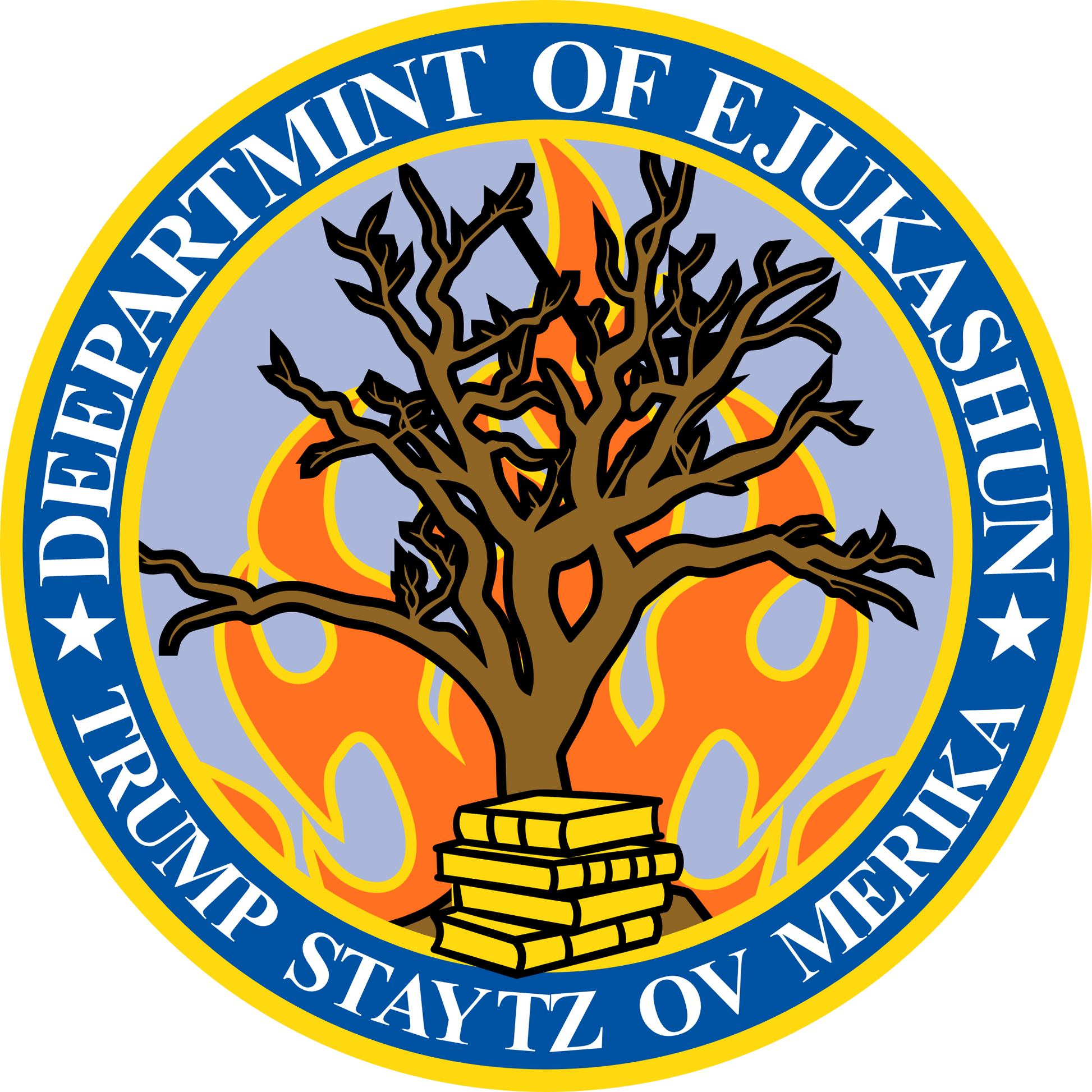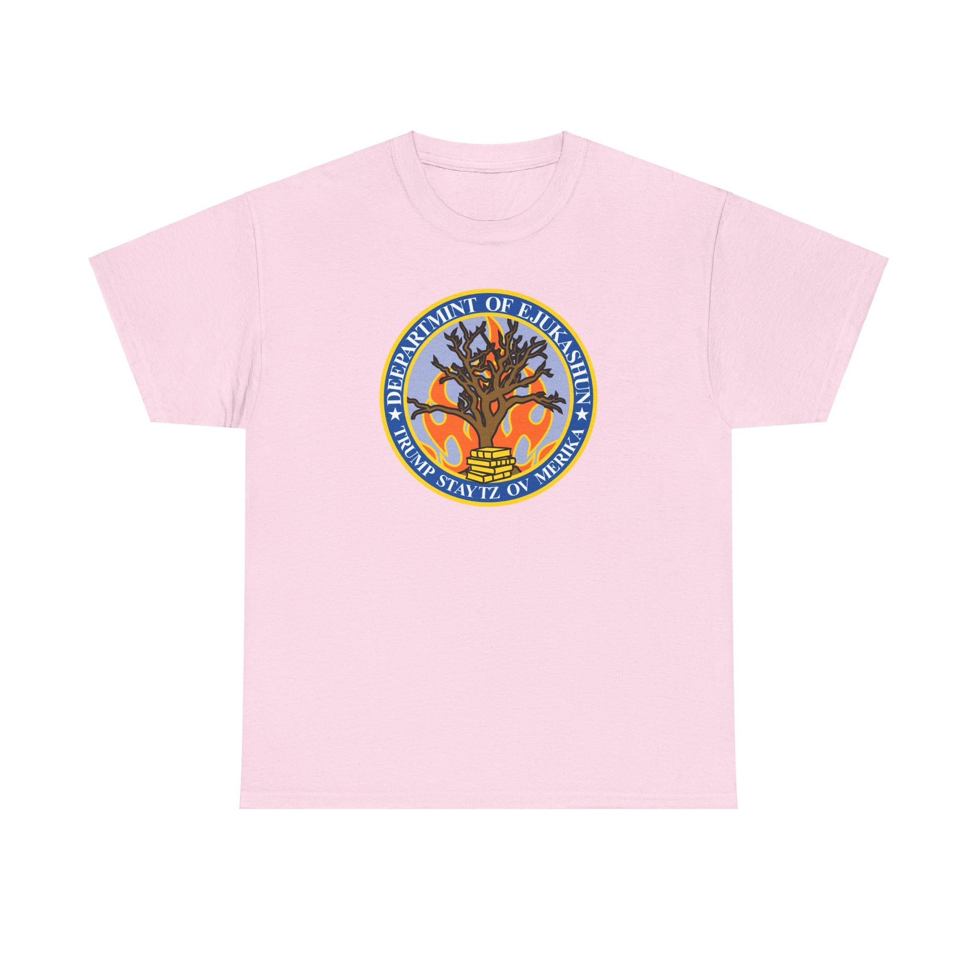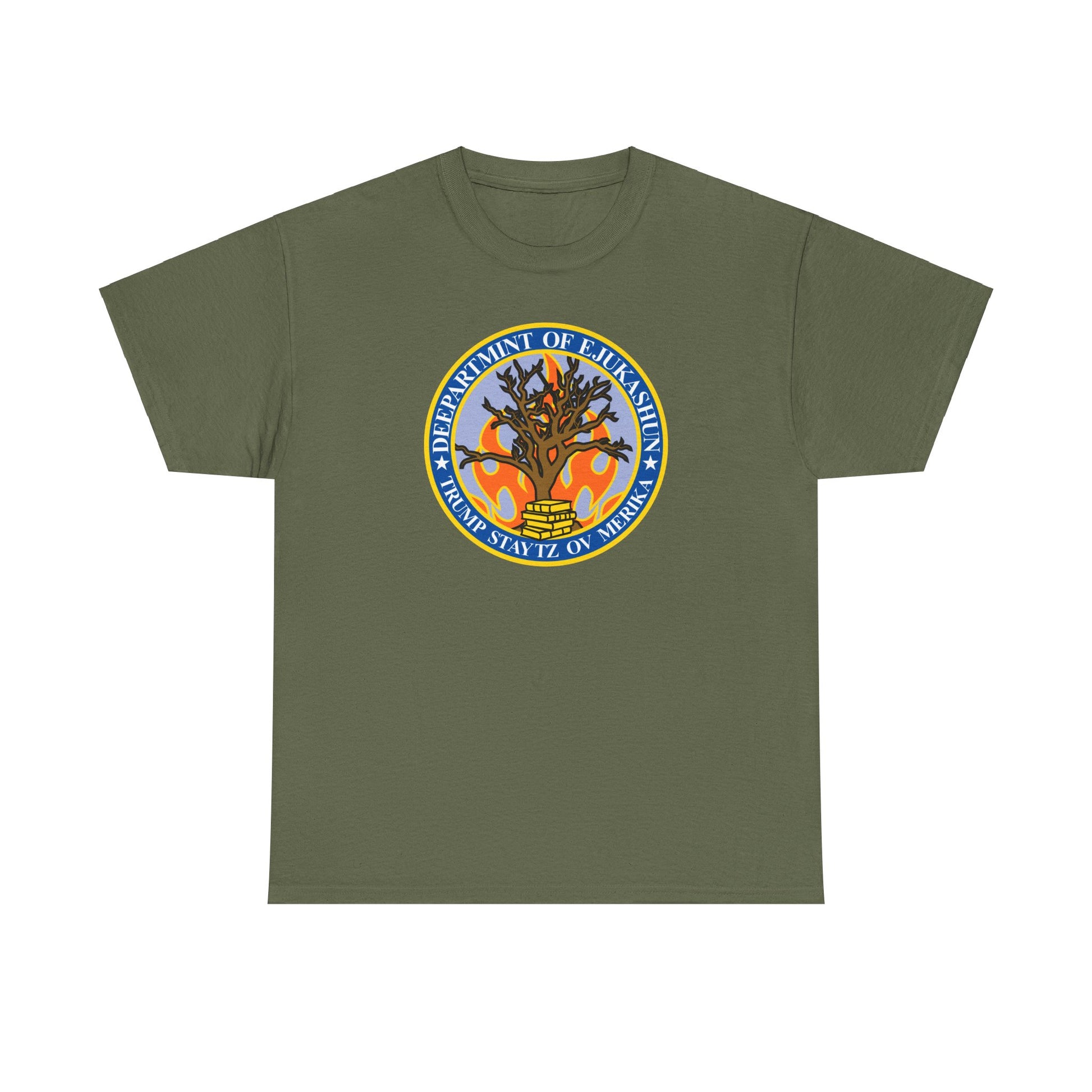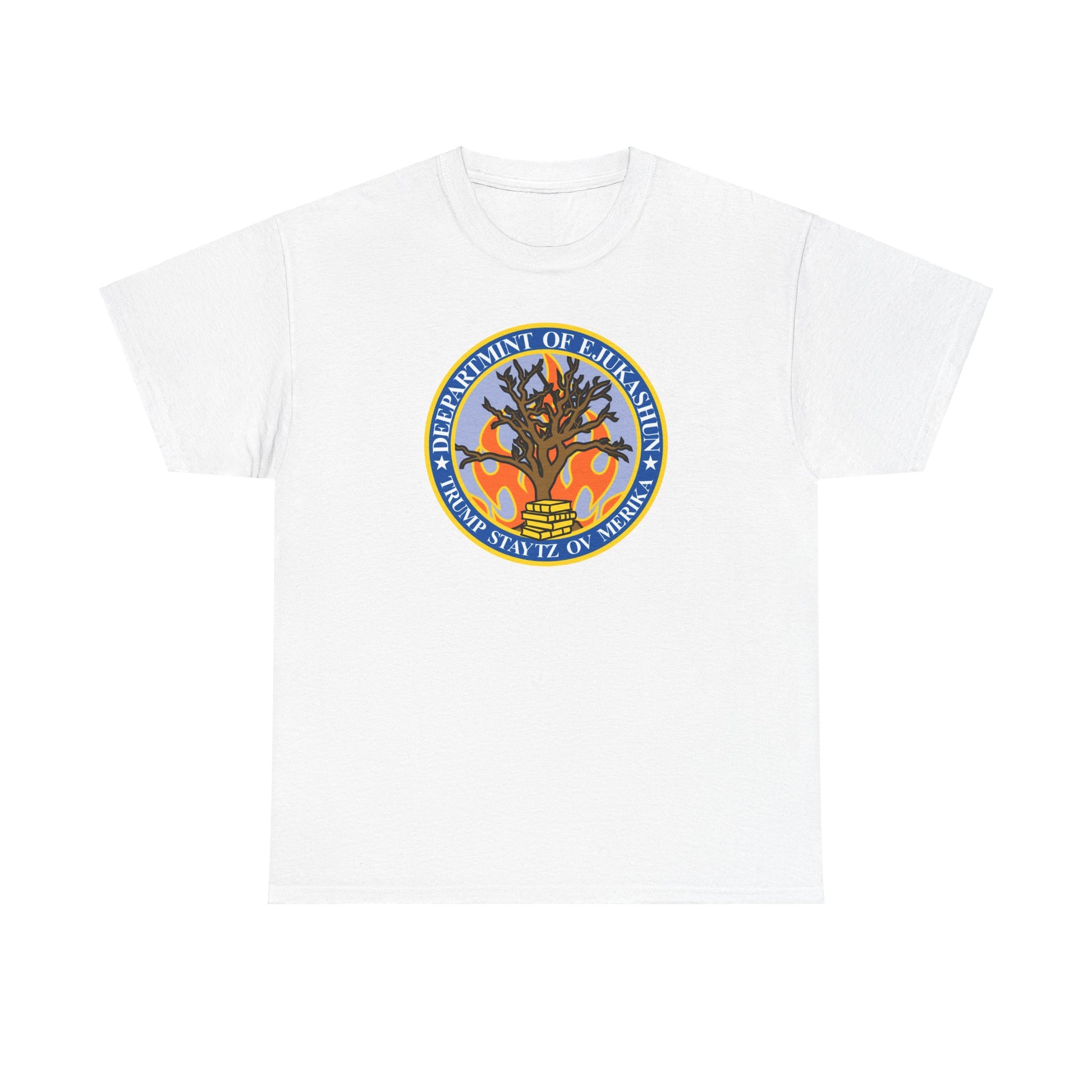 Trump Parody T-Shirt Department of Education, Misspelled as Deepartmint of Edukashun, Burning Tree, Banned Books, Dystopian, Sad Political Dark Humor