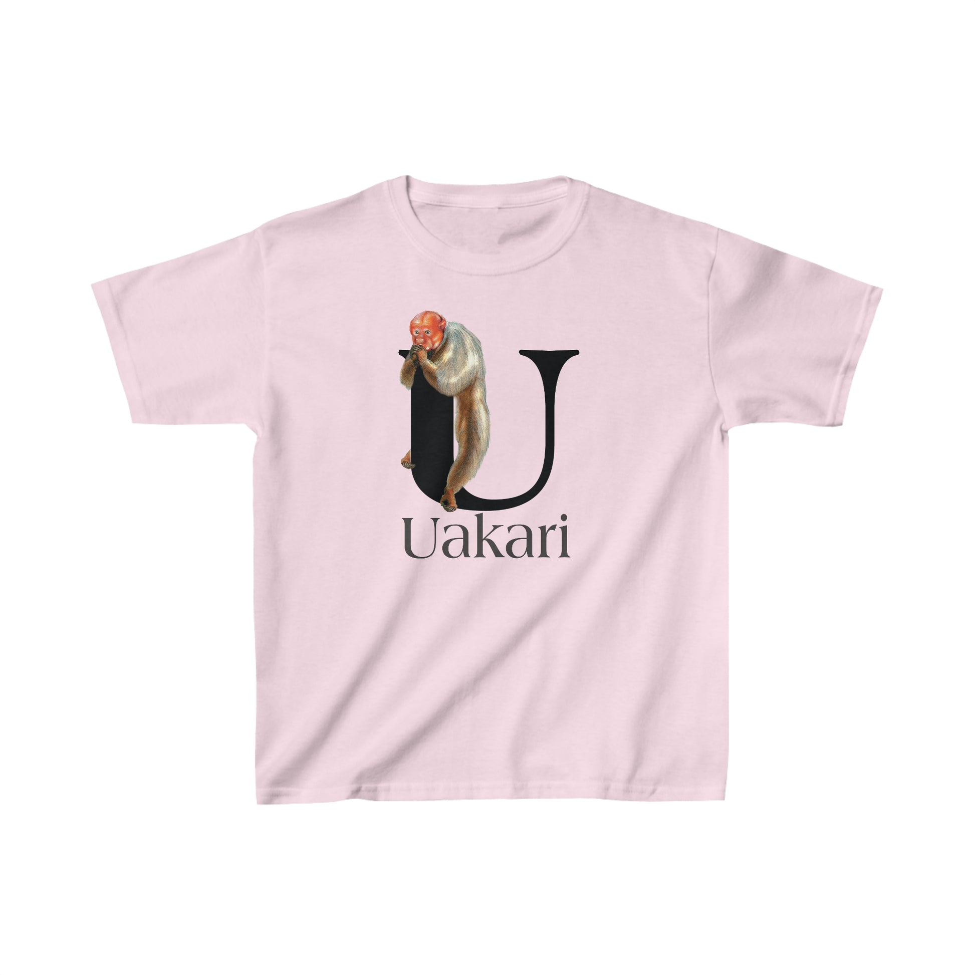 This bald headed Uakari Monkey hangs from the capital letter U. This Uakari t-shirt is designed with a classic illustrated look with bold letter U. This series of adorable animals are depicted as characters of the Alphabet. A for Alligator, to Z for Zebra.
