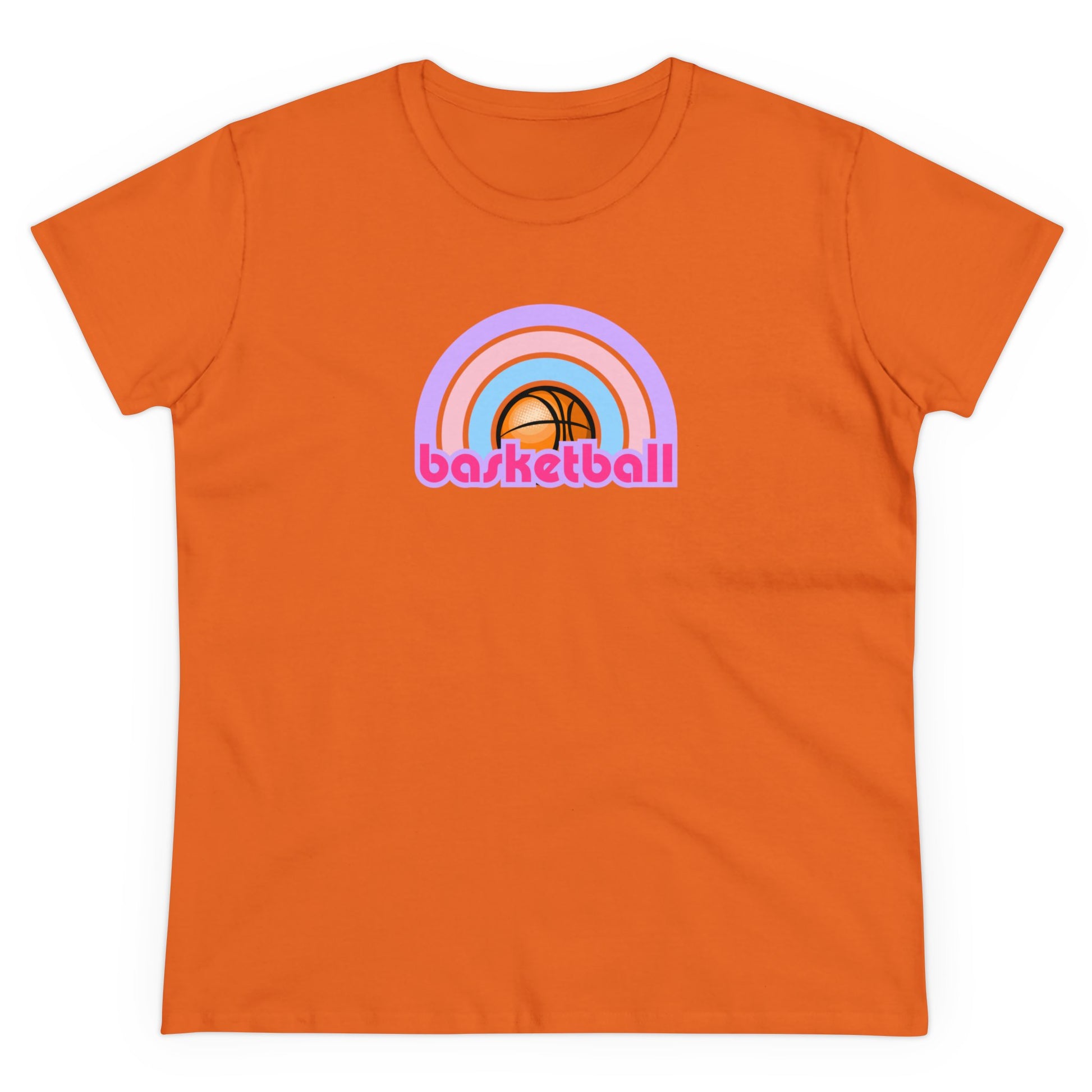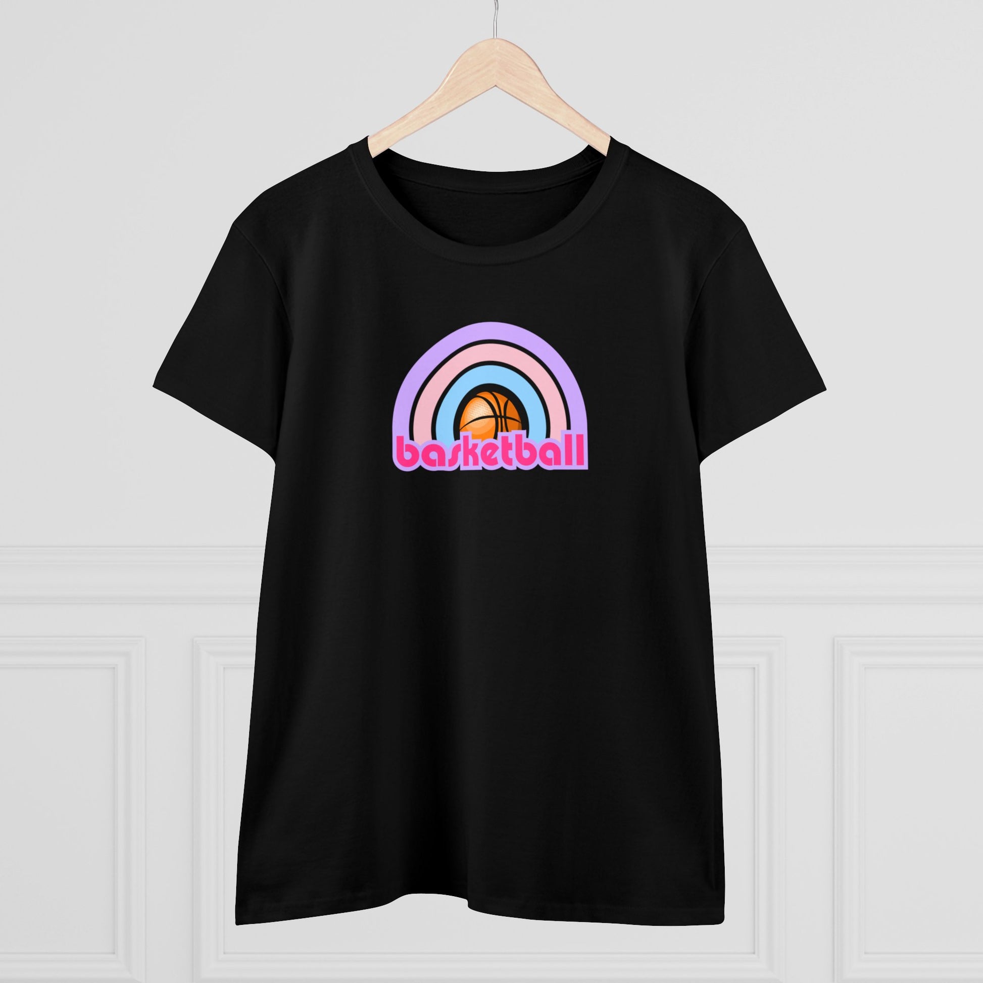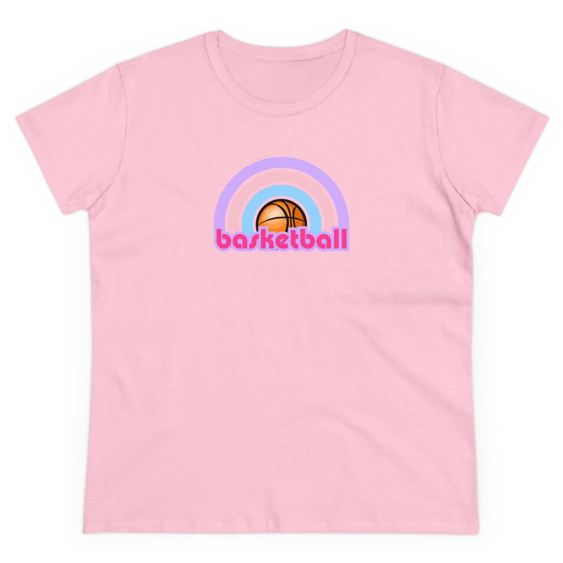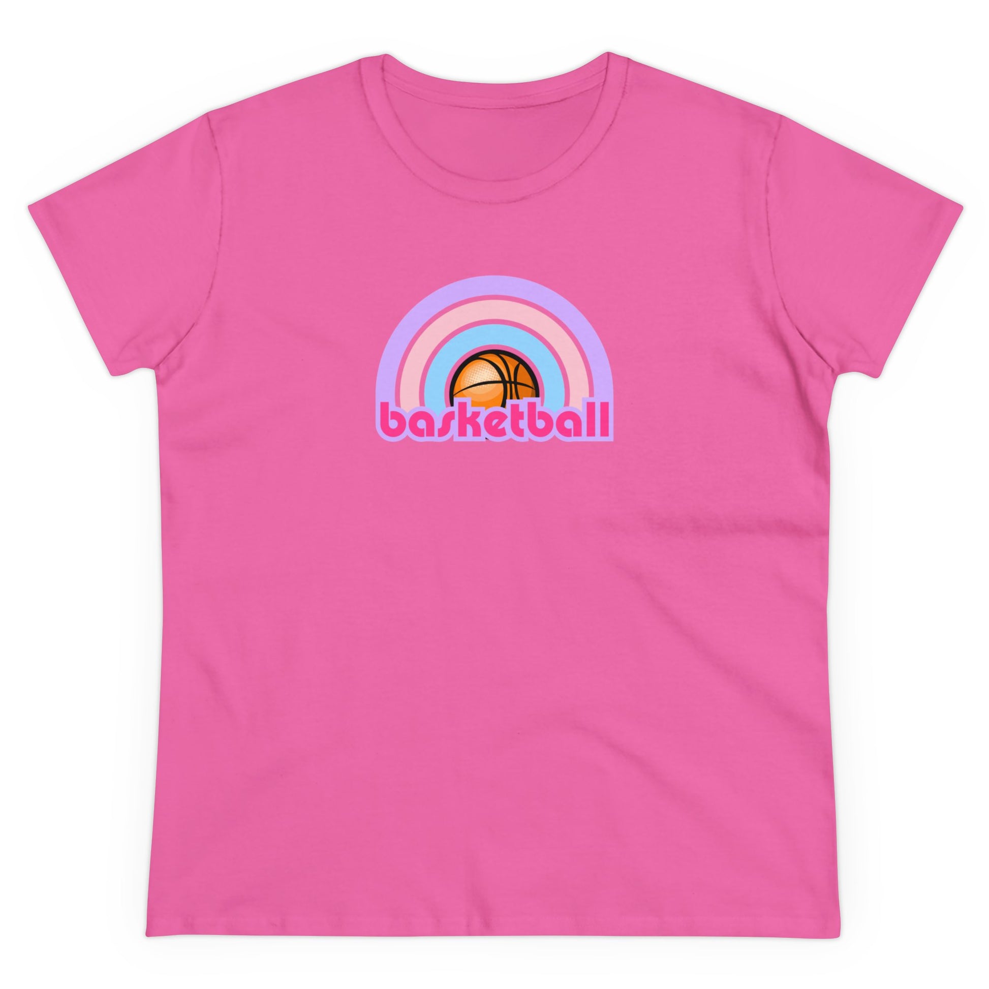 Women's Rainbow Basketball Midweight Cotton Tee, Cute Design, Retro 70's, Pink Basketball T-Shirts for Ladies, Love of Basketball