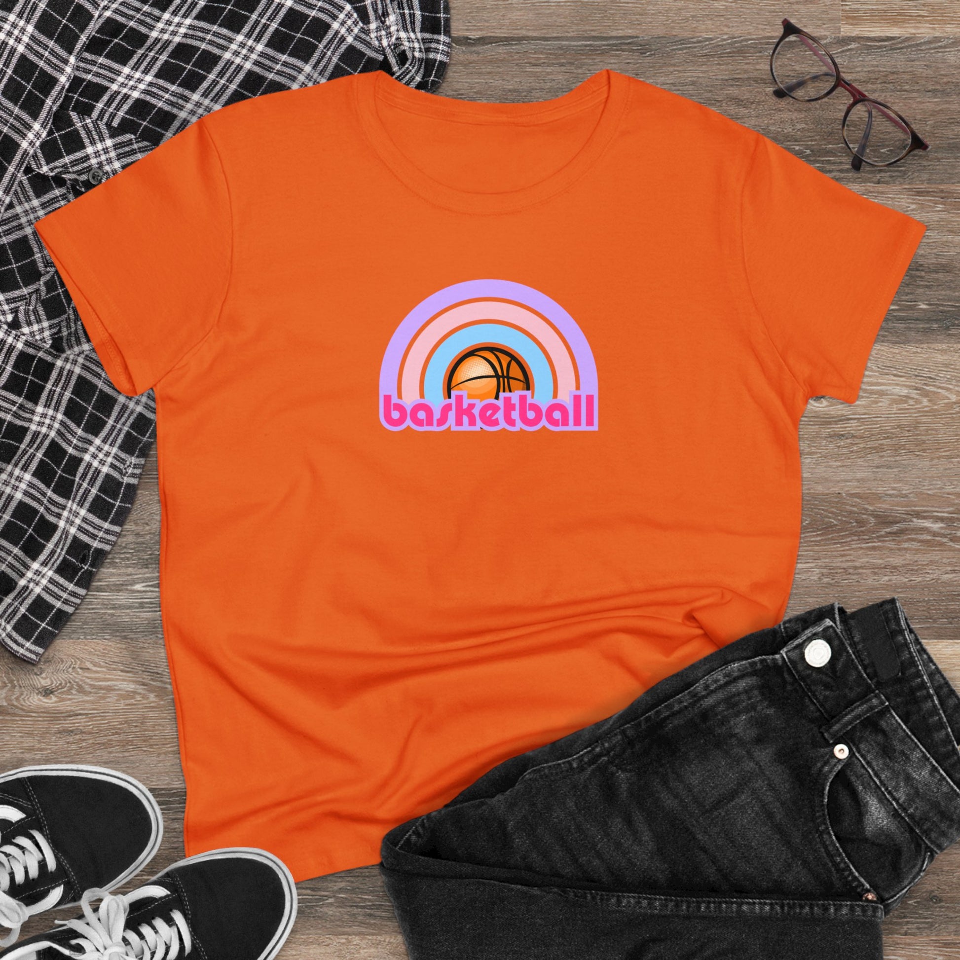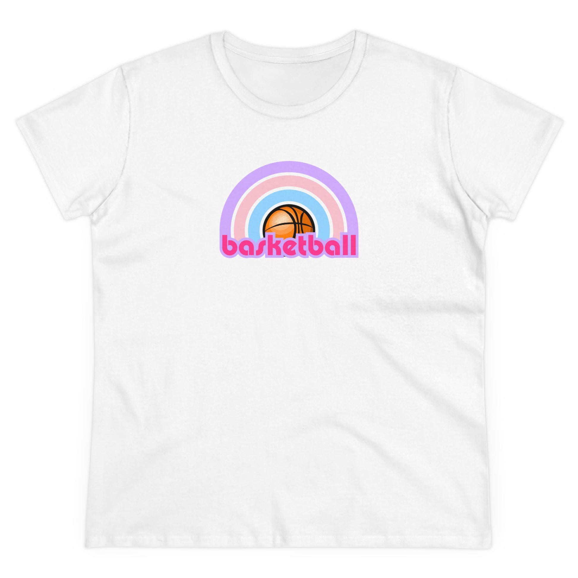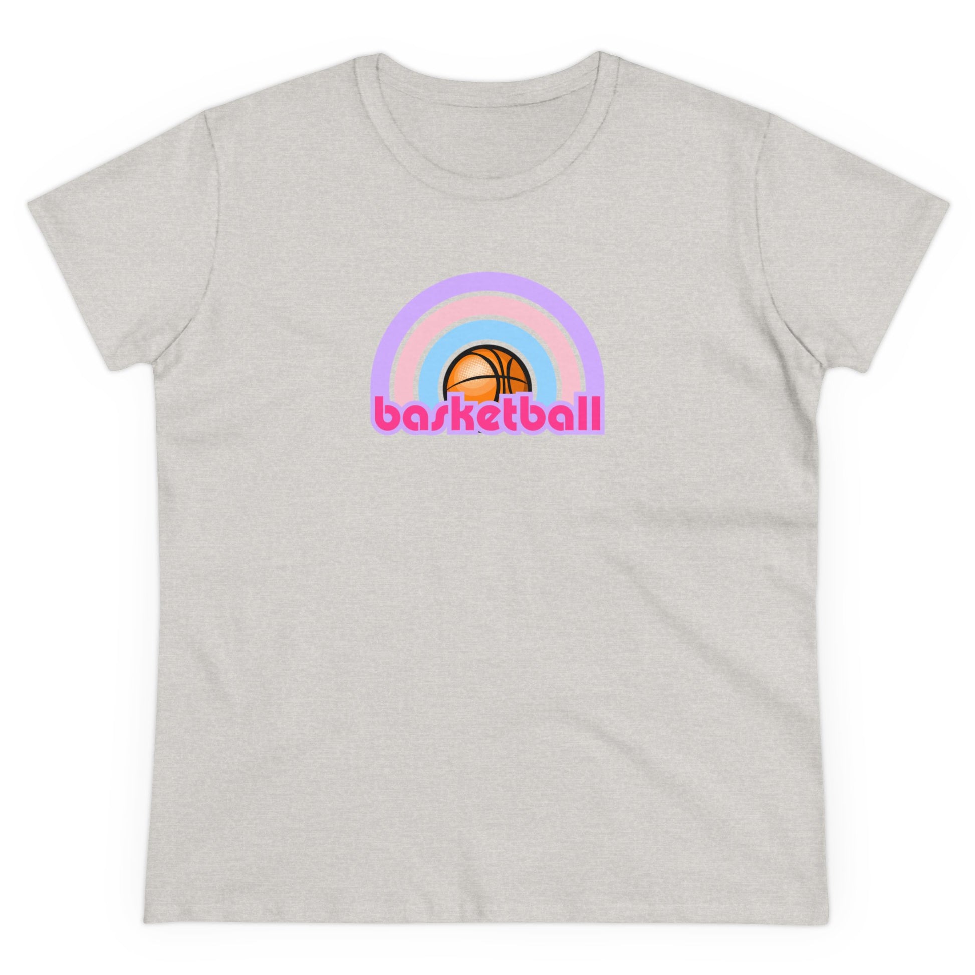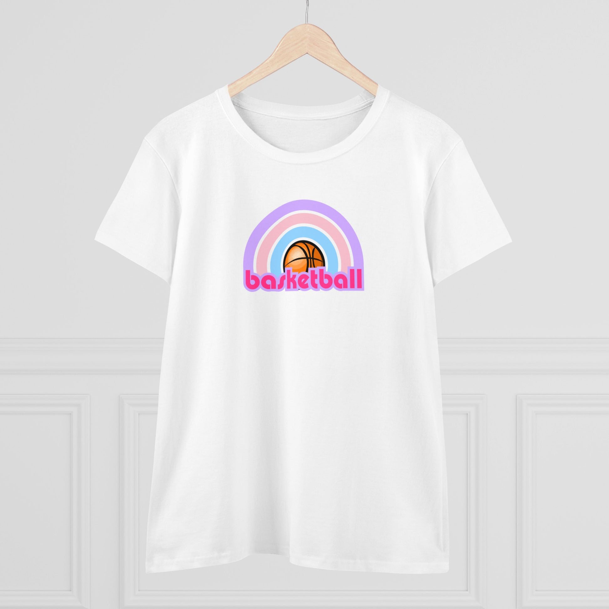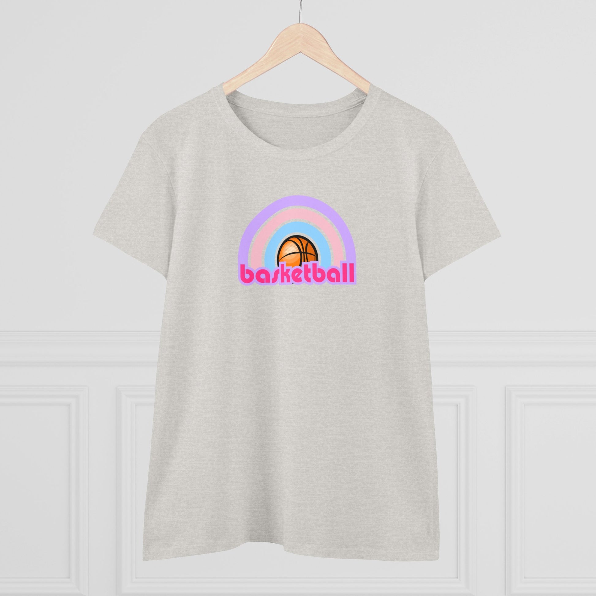 Women's Rainbow Basketball Midweight Cotton Tee, Cute Design, Retro 70's, Pink Basketball T-Shirts for Ladies, Love of Basketball