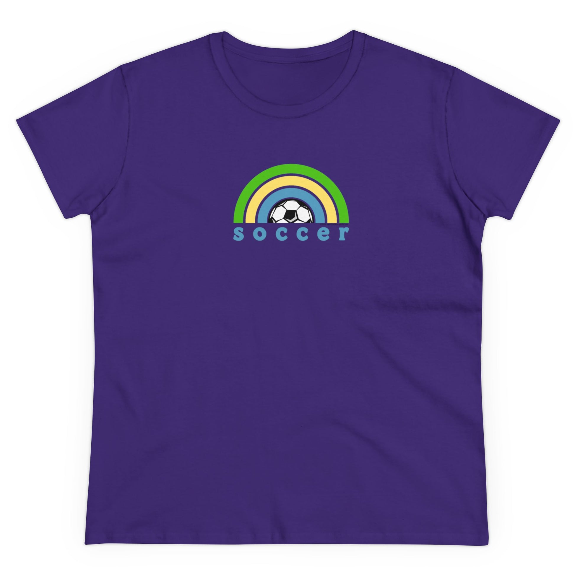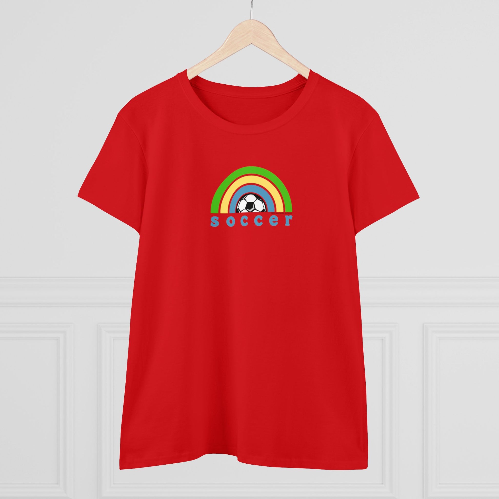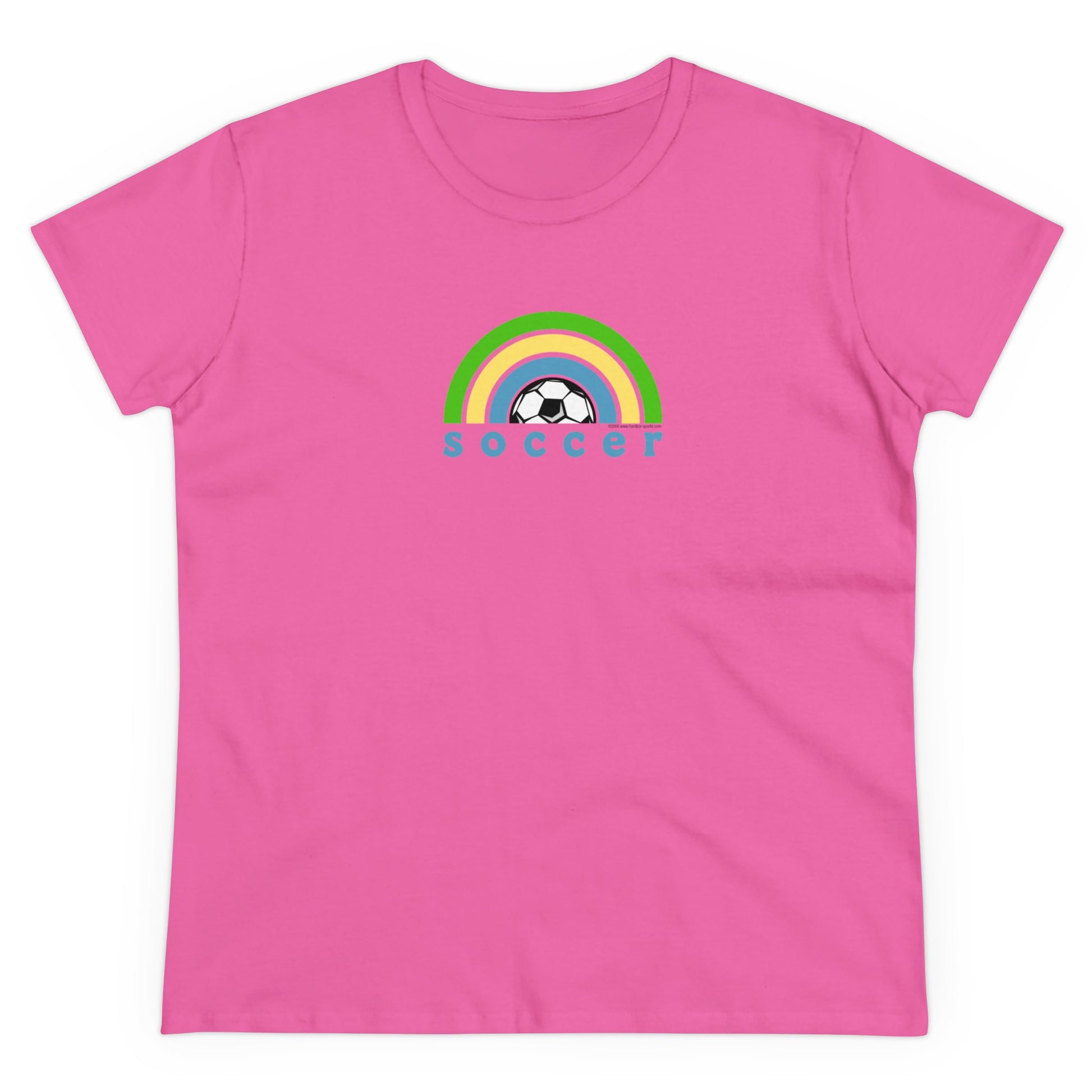 Women's Rainbow Soccer Midweight Cotton Tee, Cute Design, Retro 70's, Pink Soccer T-Shirts for Ladies, Love of Soccer