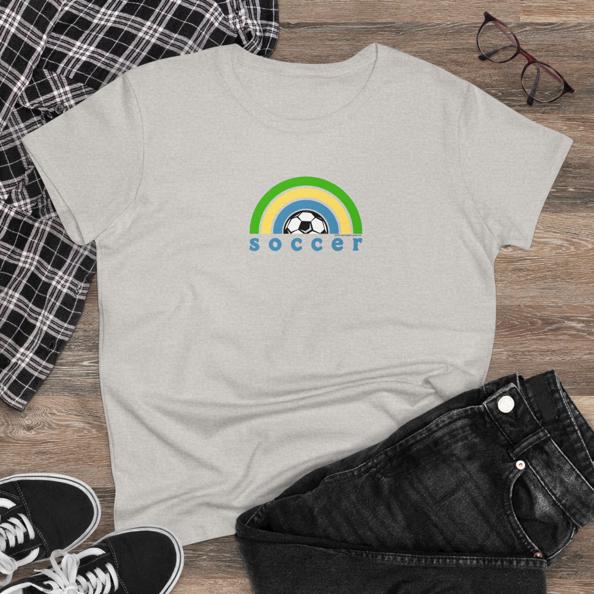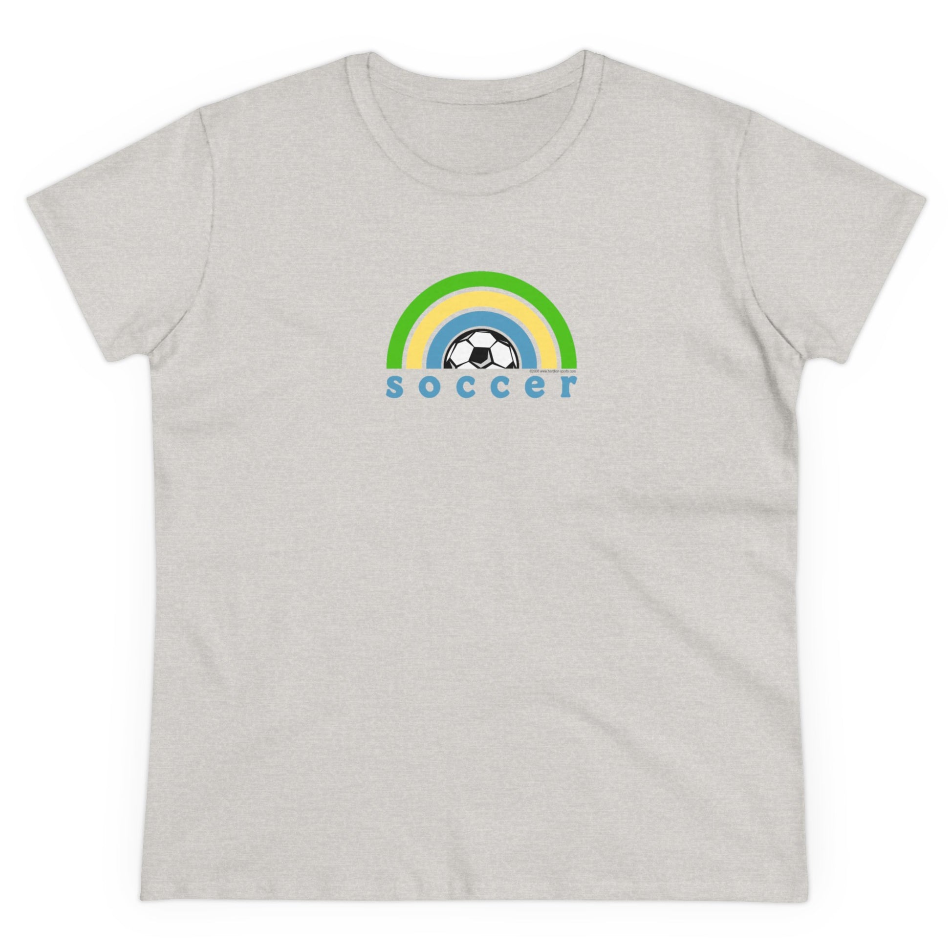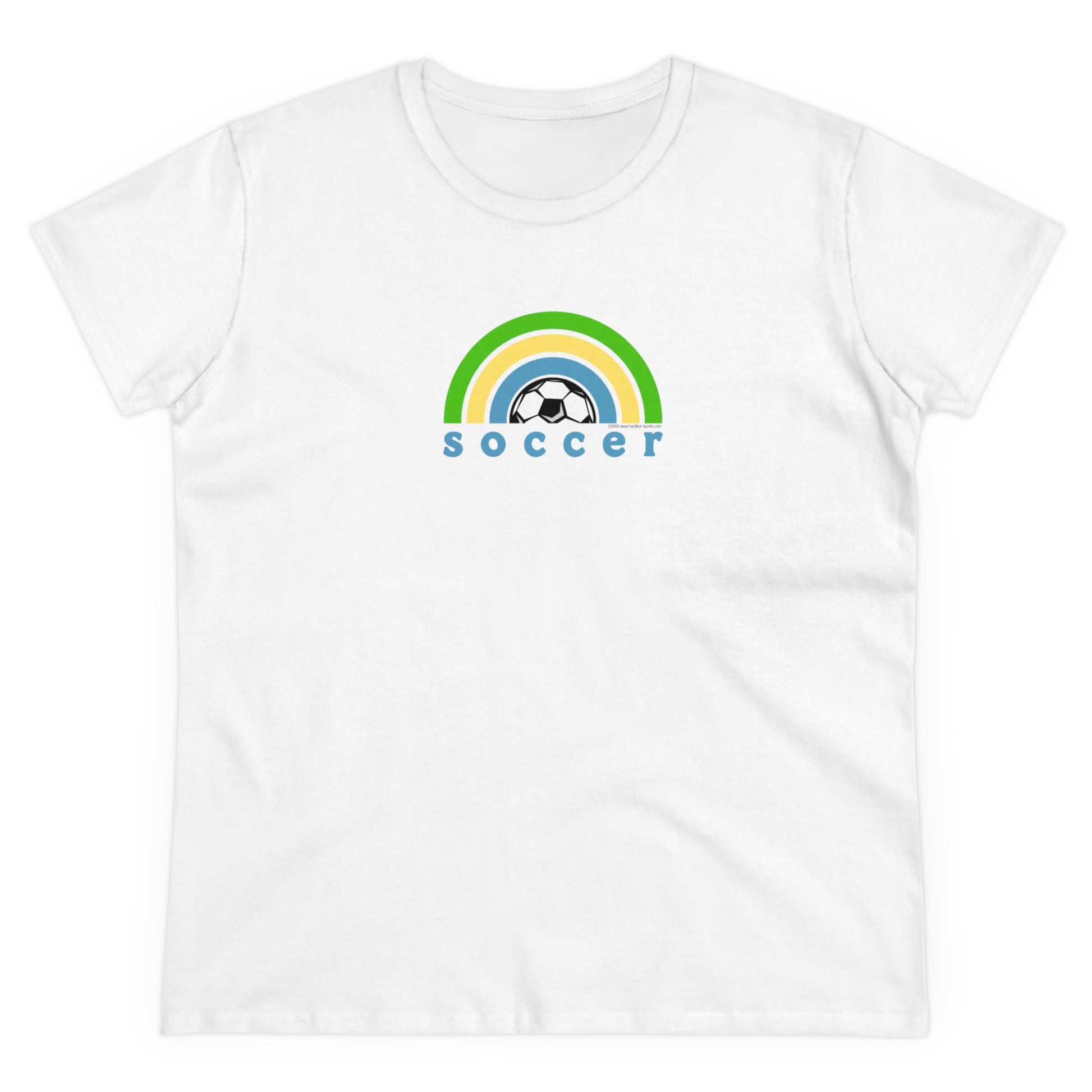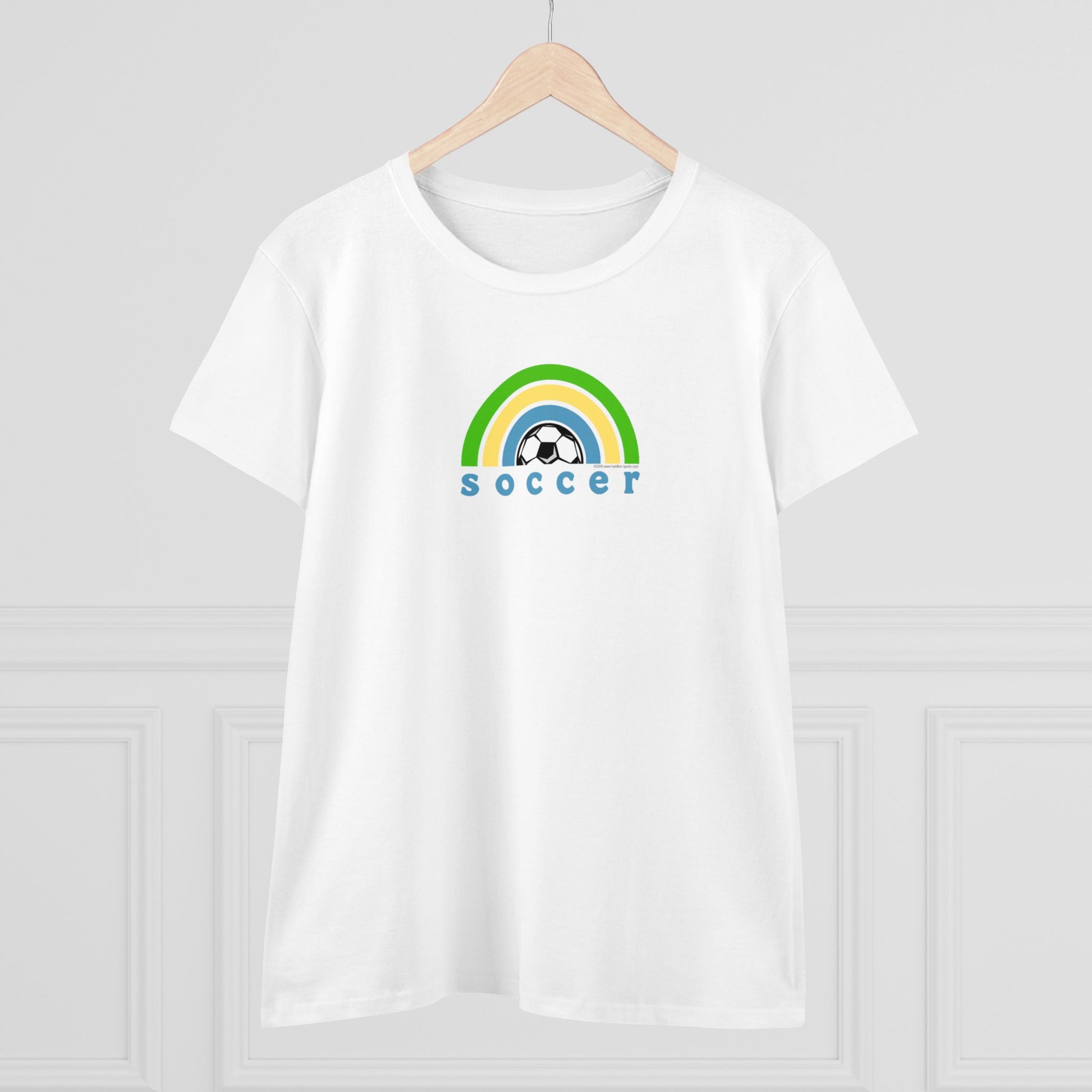 Women's Rainbow Soccer Midweight Cotton Tee, Cute Design, Retro 70's, Pink Soccer T-Shirts for Ladies, Love of Soccer