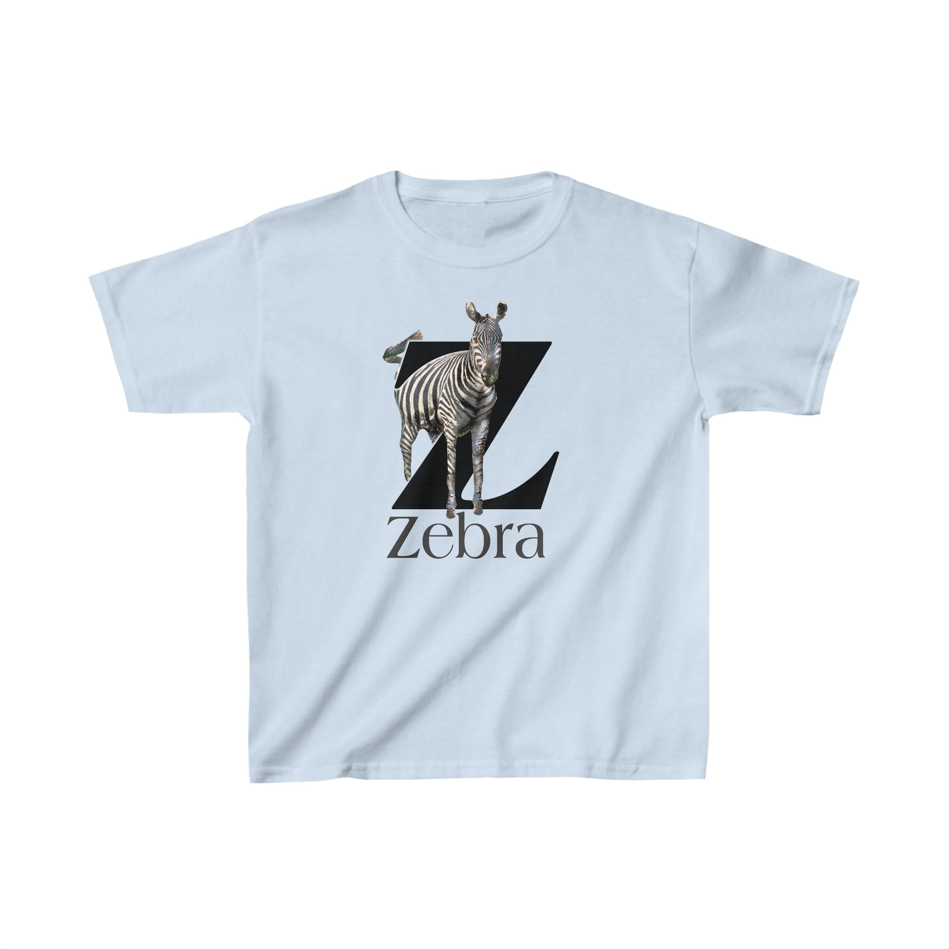 This striped zebra peaks out from behind the capital letter Z . This zebra t-shirt is designed with a classic illustrated look with bold letter Z. This series of adorable animals are depicted as characters of the Alphabet. A for Alligator, to Z for Zebra.